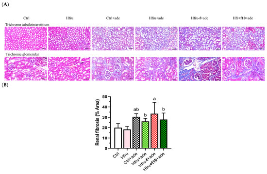 Representative Masson’s trichrome-stained kidney sections are shown in Figure 3A. Trichrome staining of the tubulointerstitium was used to evaluate scarring or fibrosis by assessing collagen deposition, while glomerular staining also reflected fibrotic changes. Hfru−f+ade mice exhibited the highest percentage of fibrotic area (Figure 3B).