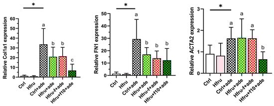 Fibrosis-related gene expression in renal tissue was also evaluated. As shown in Figure 4, Ctrl+ade mice exhibited the highest expression levels of Col1a1, Fn1, and Acta2. Because tissue samples for gene expression analysis and histopathological assessment were collected simultaneously, it is possible that some transcripts had already been translated into protein and subsequently degraded. Consequently, Hfru−f+ade mice displayed the greatest accumulation of fibrotic protein despite lower mRNA expression levels compared with Ctrl+ade mice.