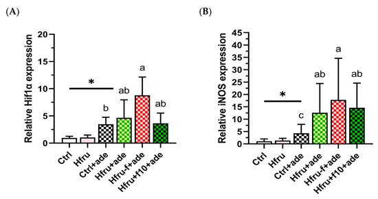 To determine whether long-term high-fructose intake, folate status, and adenine induction contribute to renal hypoxia, renal expression of Hif1α and iNos was assessed (Figure 5). Renal hypoxia-related gene expression was observed only after adenine induction. As shown in Figure 5A, adenine significantly increased renal Hif1α expression, with Hfru−f+ade mice exhibiting higher levels than Hfru+f10+ade mice. A similar pattern was observed for iNos expression (Figure 5B), in which folate deficiency enhanced expression, whereas folate supplementation suppressed it. These findings indicate that folate deficiency aggravates renal hypoxia and the associated inflammatory responses in the adenine-induced nephropathy.