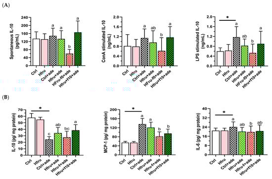 To assess the effects of high fructose intake, folate status, and adenine induction on immune responses, cytokine secretion by mitogen-stimulated splenocytes and cytokine levels in renal tissue were measured. As shown in Figure 6A, IL-10 secretion by lipopolysaccharide (LPS)-stimulated splenocytes increased significantly following adenine induction. However, Hfru−f+ade mice exhibited significantly lower IL-10 secretion compared with the Ctrl+ade and Hfru+ade groups, whereas IL-10 secretion in Hfru+f10+ade mice did not differ from these groups.