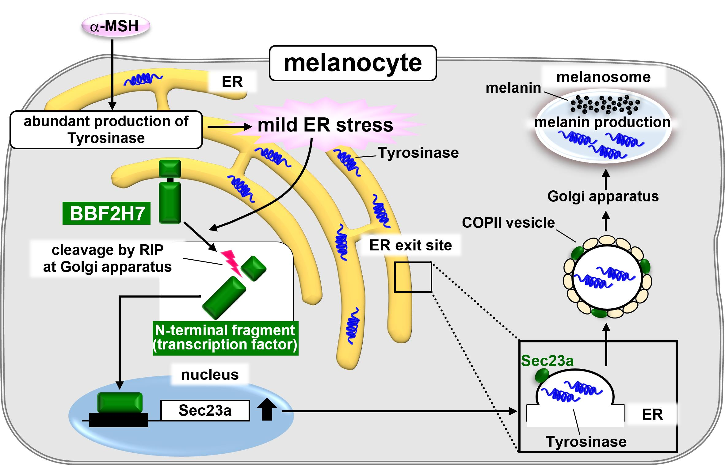 Phan GH, Fujise K, Imaizumi K, Saito A. Vesicular Transport Mediated by Endoplasmic Reticulum Stress Sensor BBF2H7 Orchestrates Melanin Production During Melanogenesis. International Journal of Molecular Sciences. 2026; 27(1):501. https://doi.org/10.3390/ijms27010501