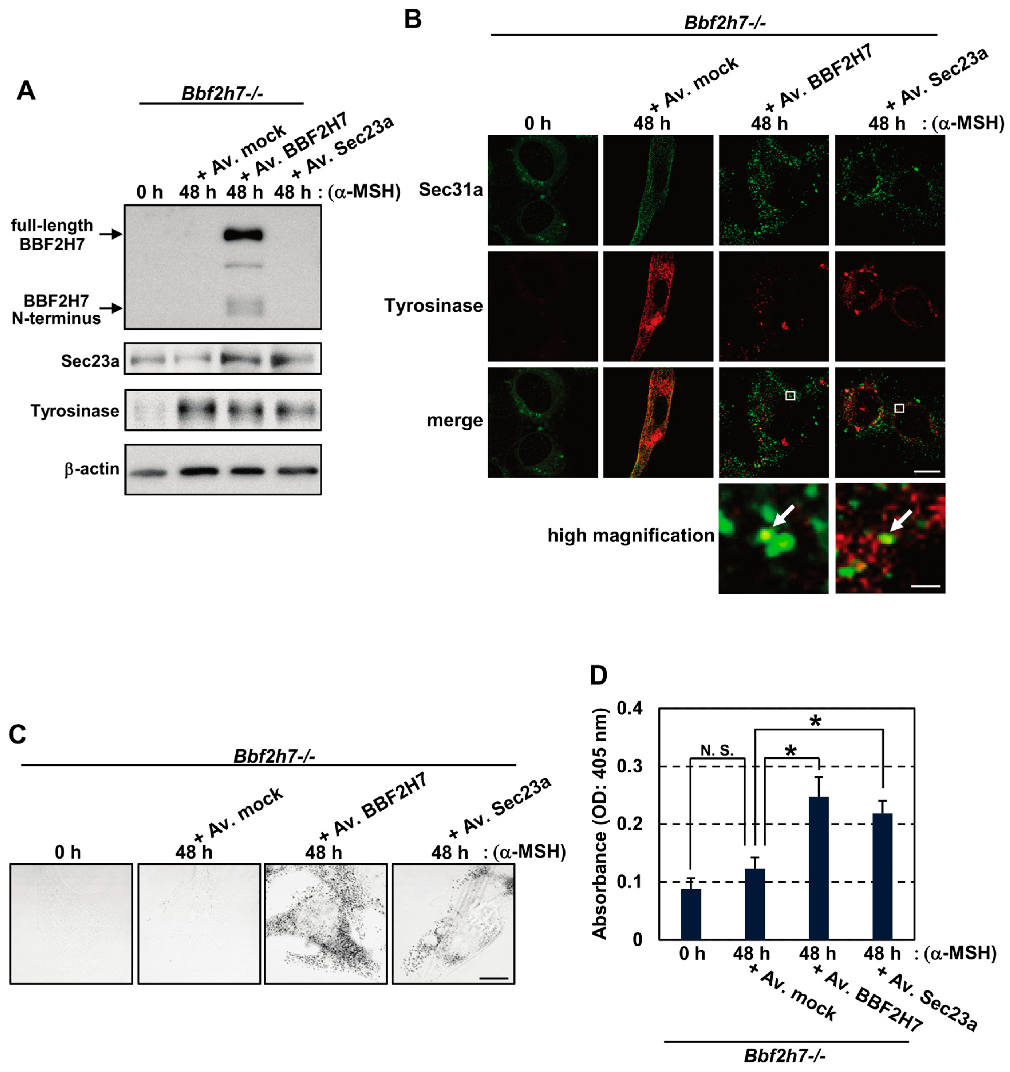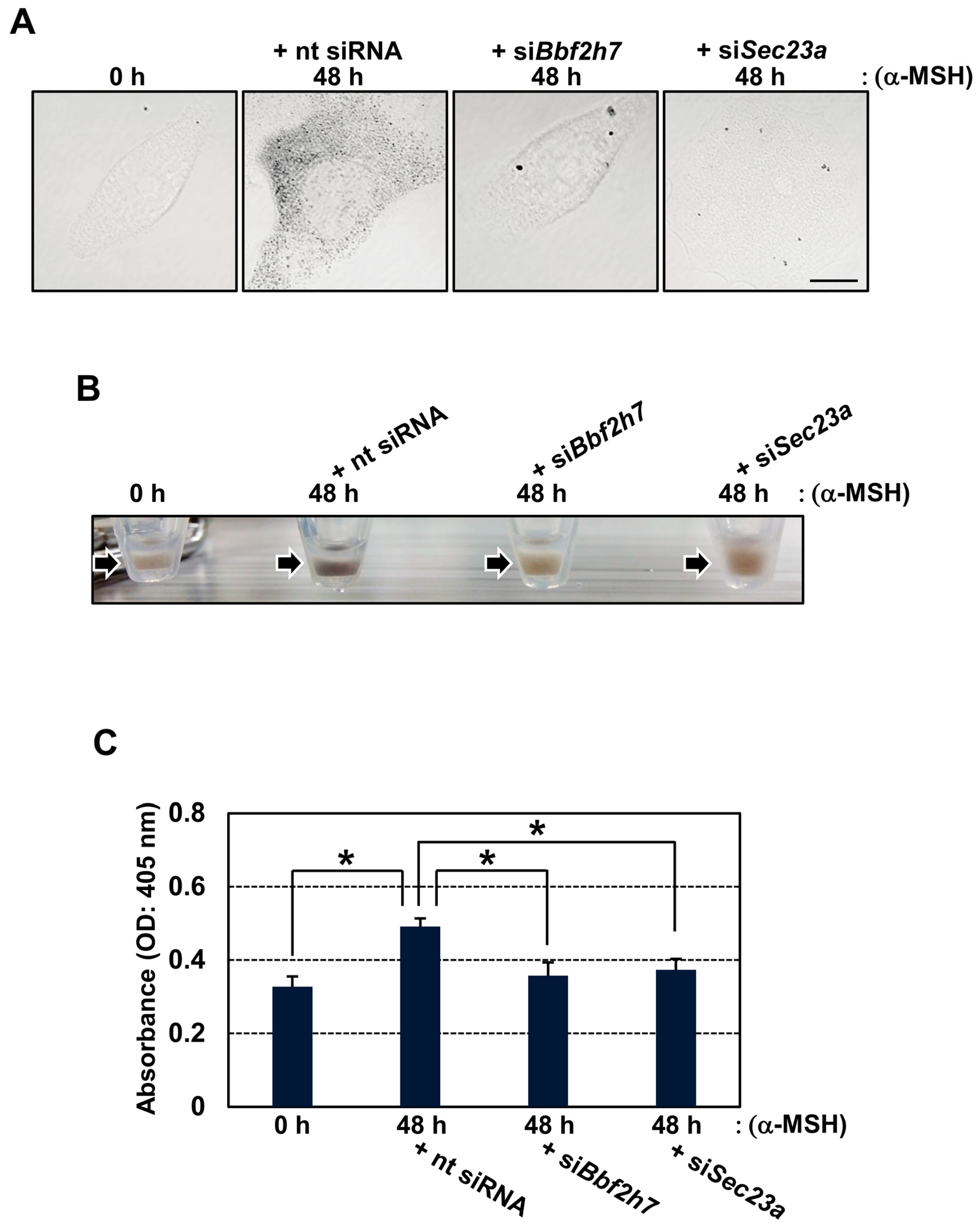 2.4. Restoration of the BBF2H7-Sec23a Pathway Promotes Vesicular Transport of Tyrosinase and Melanin Production