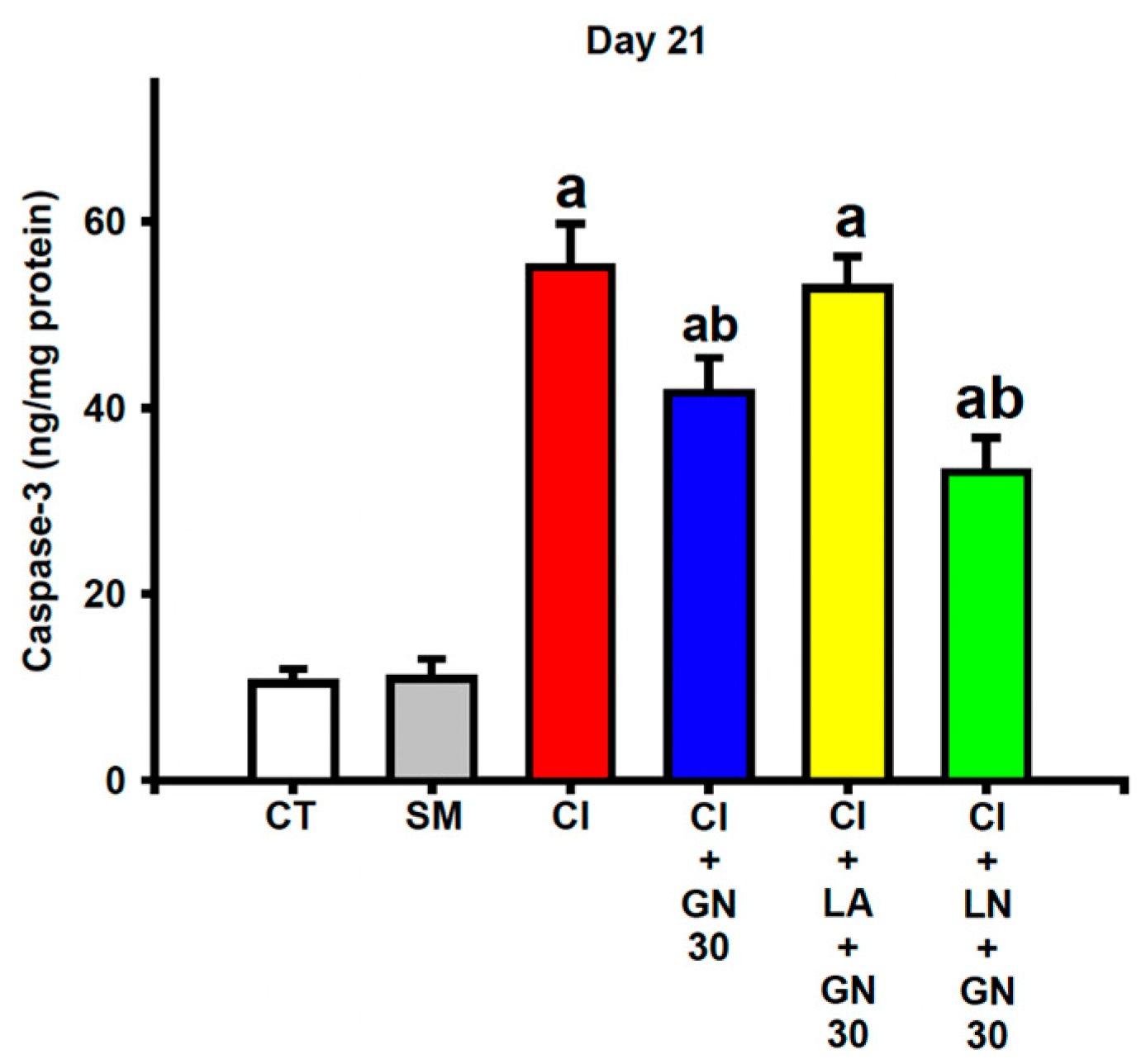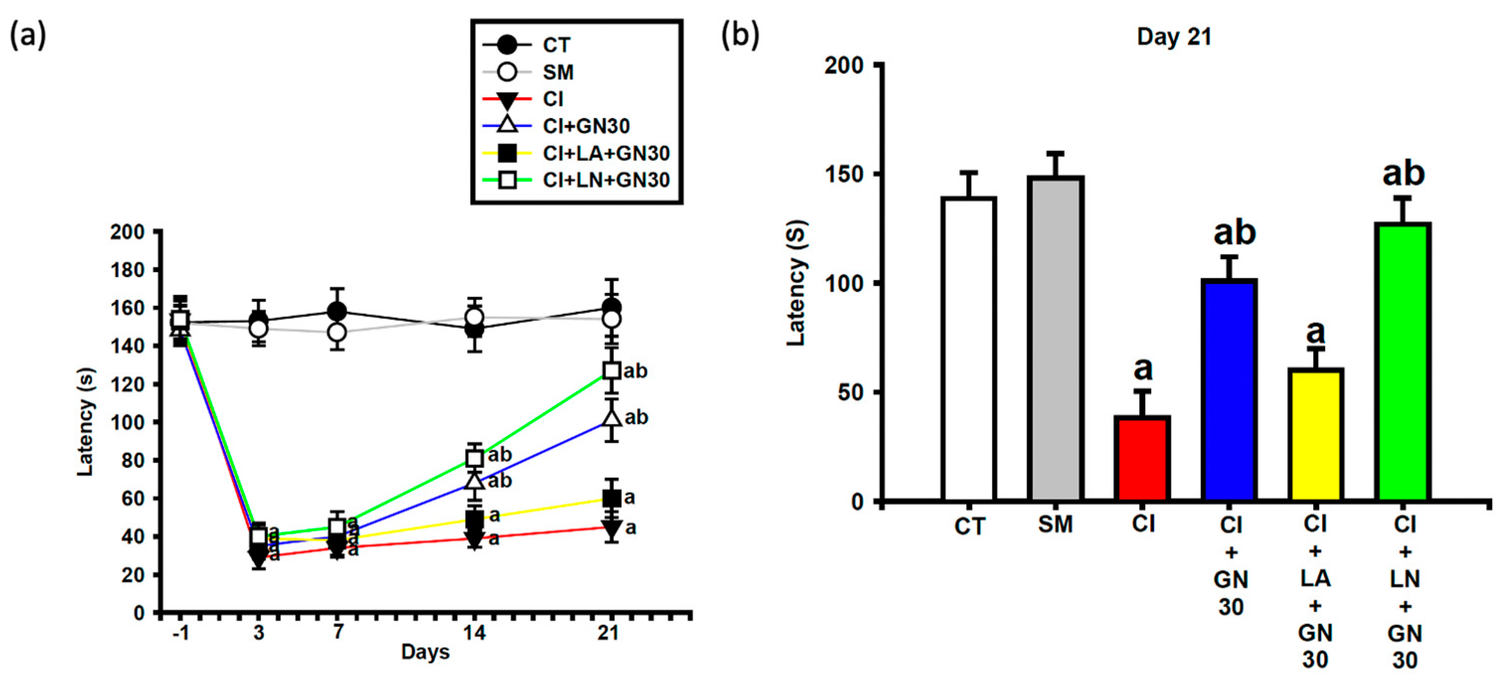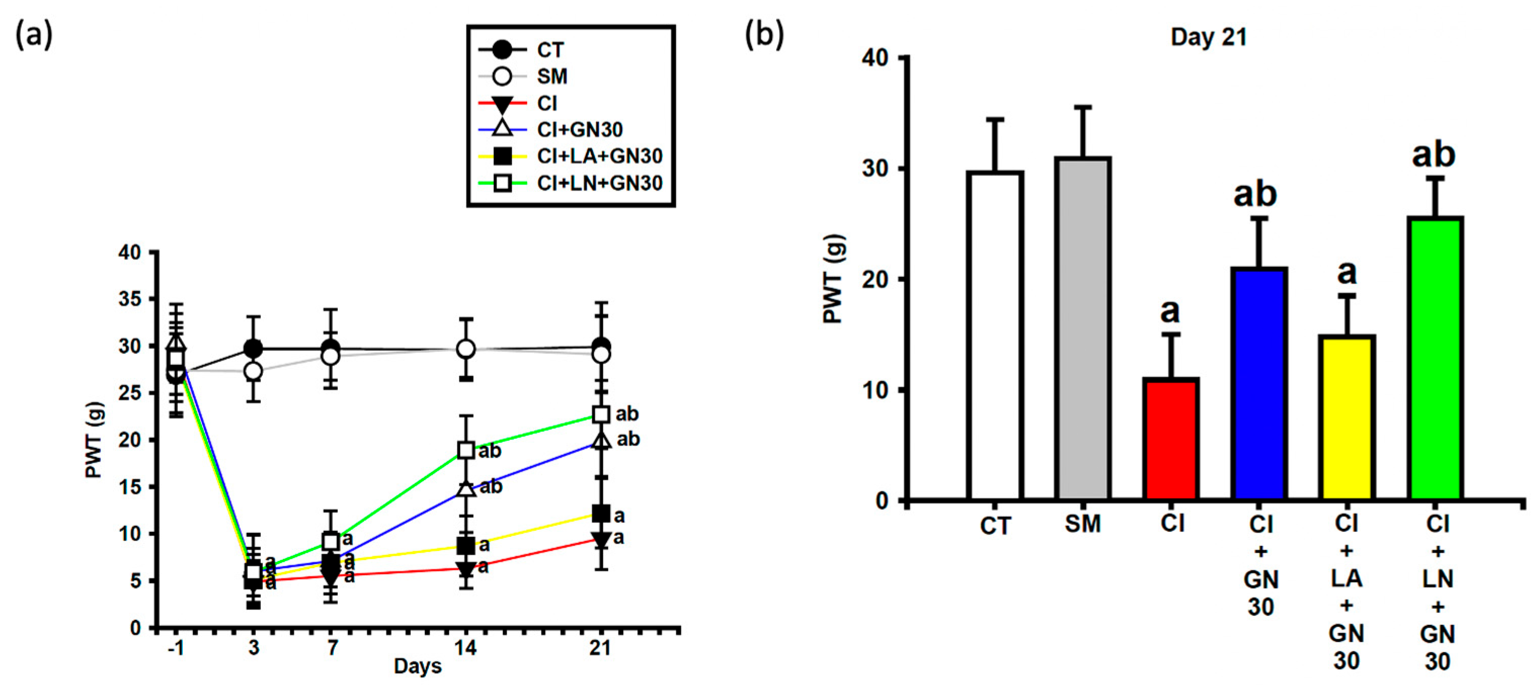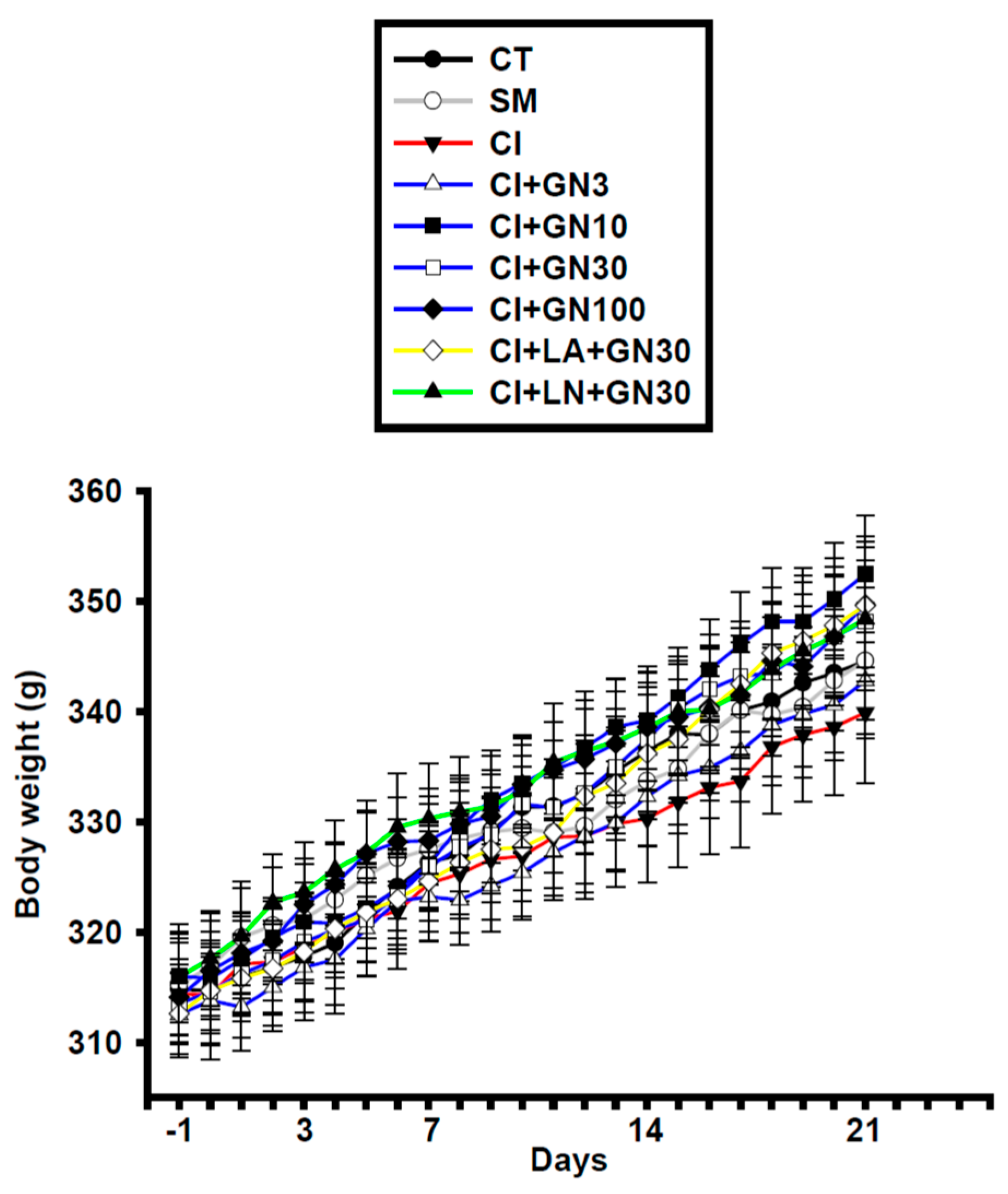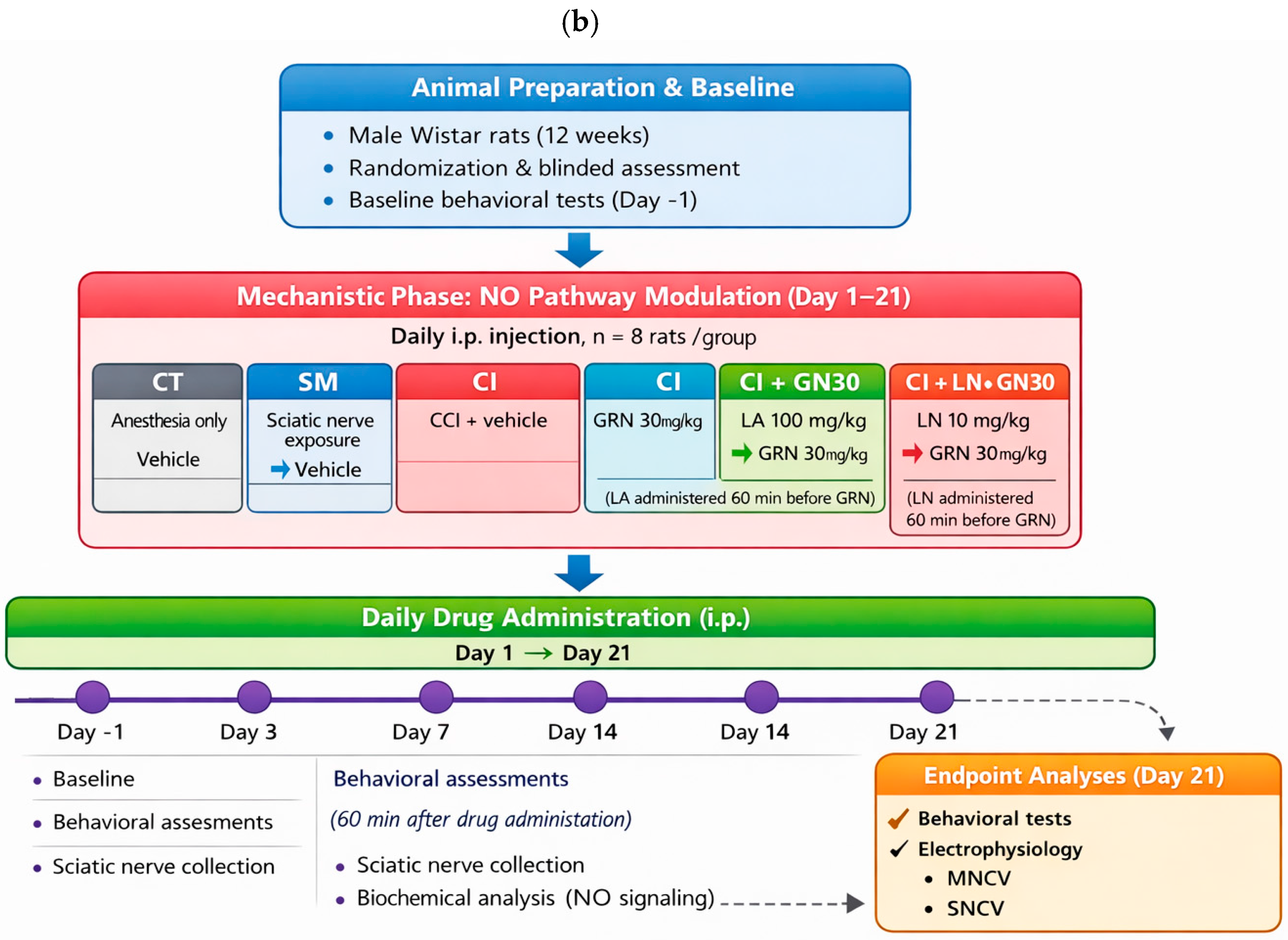 Behavioral tests were conducted one day before surgery (day −1) and on days 3, 7, 14, and 21 following CCI, with assessments performed 60 min after drug administration on each testing day. Following the final behavioral evaluation on day 21, selected groups (CT, SM, CI, CI+GN30, CI+LA+GN30, and CI+LN+GN30) underwent electrophysiological recordings of motor and sensory nerve conduction velocities. Animals were euthanized approximately 1 h after electrophysiological assessment, and sciatic nerve tissues were collected immediately for biochemical analyses. Throughout the study, animals were monitored daily for general health and postoperative recovery. Any losses were recorded and were not associated with GRN treatment. A schematic representation of the experimental workflow, group allocation, dosing schedule, and assessment timeline is provided in