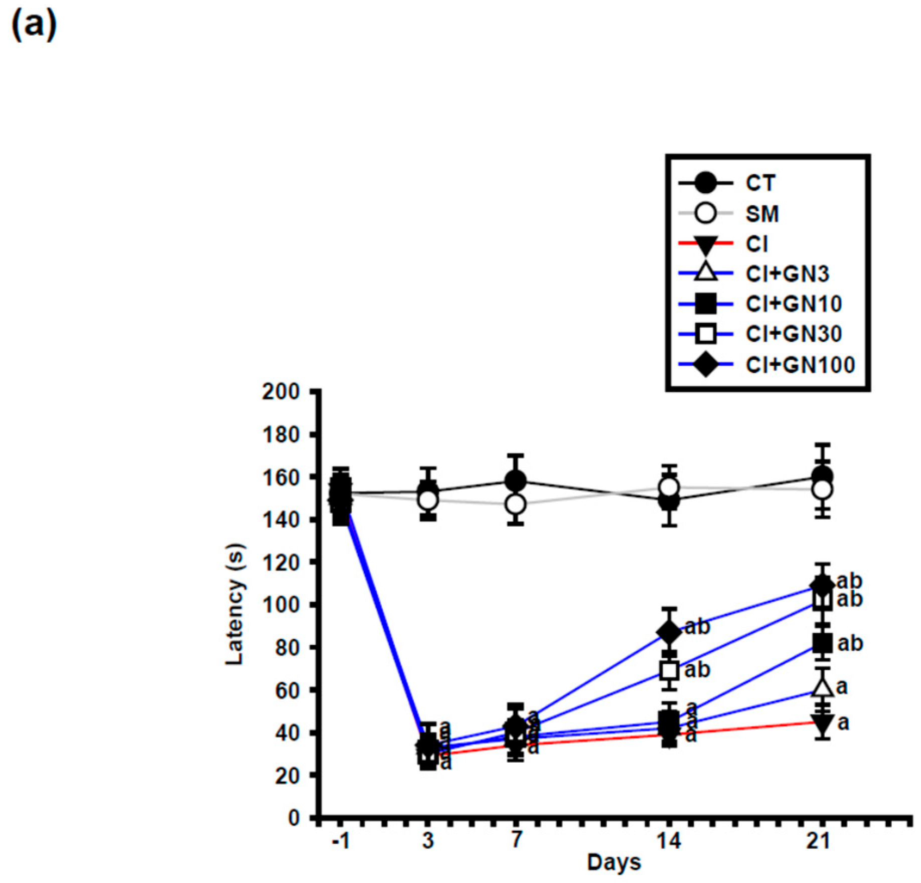 2.1. GRN Reduces CCI-Evoked Thermal Hypersensitivity