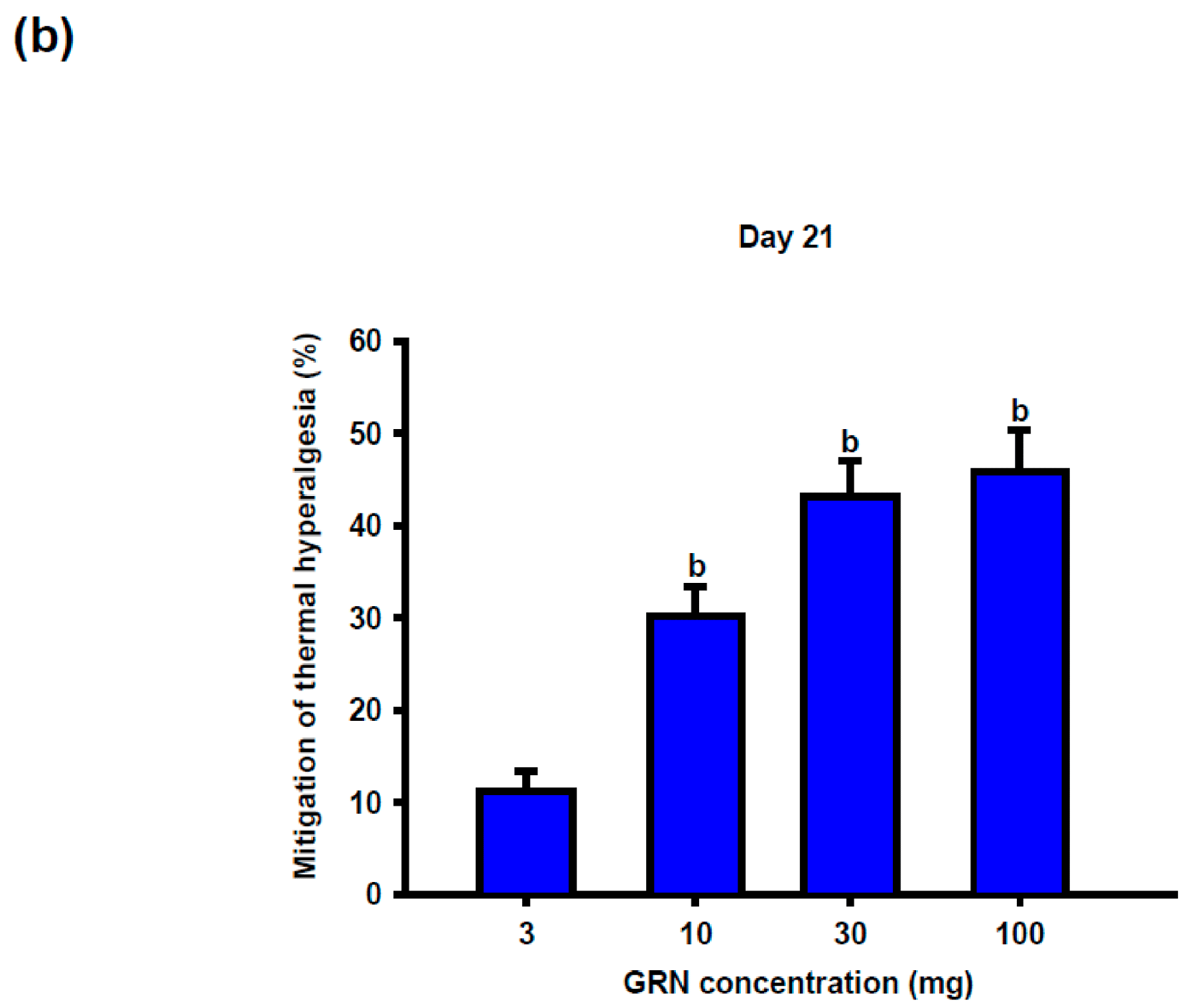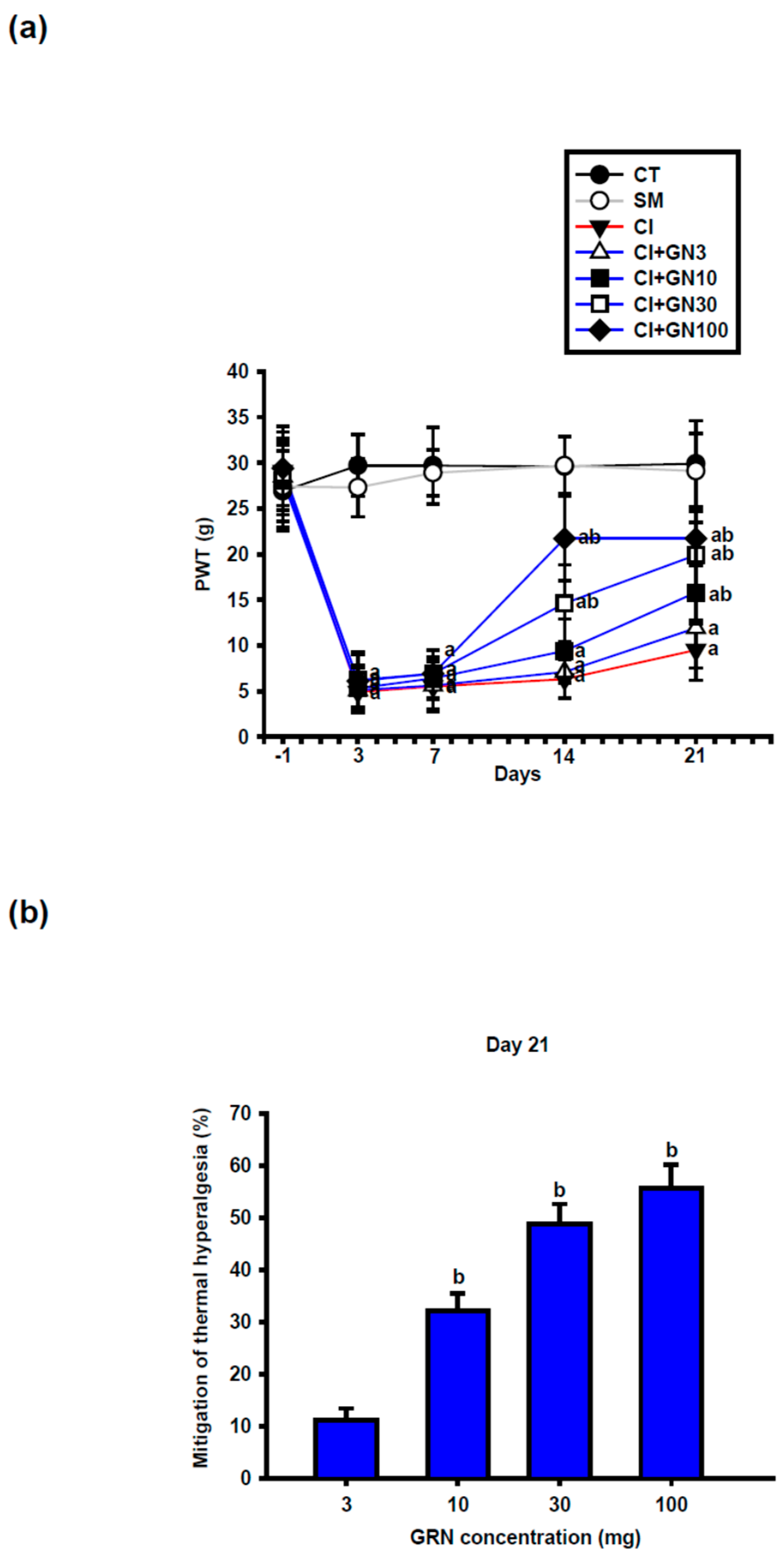 GRN administration significantly increased PWT values at later time points, with improvement becoming apparent from day 14 at doses ≥30 mg/kg and persisting through day 21. The 30 and 100 mg/kg doses produced comparable antihyperalgesic effects, whereas the lowest dose was less effective (