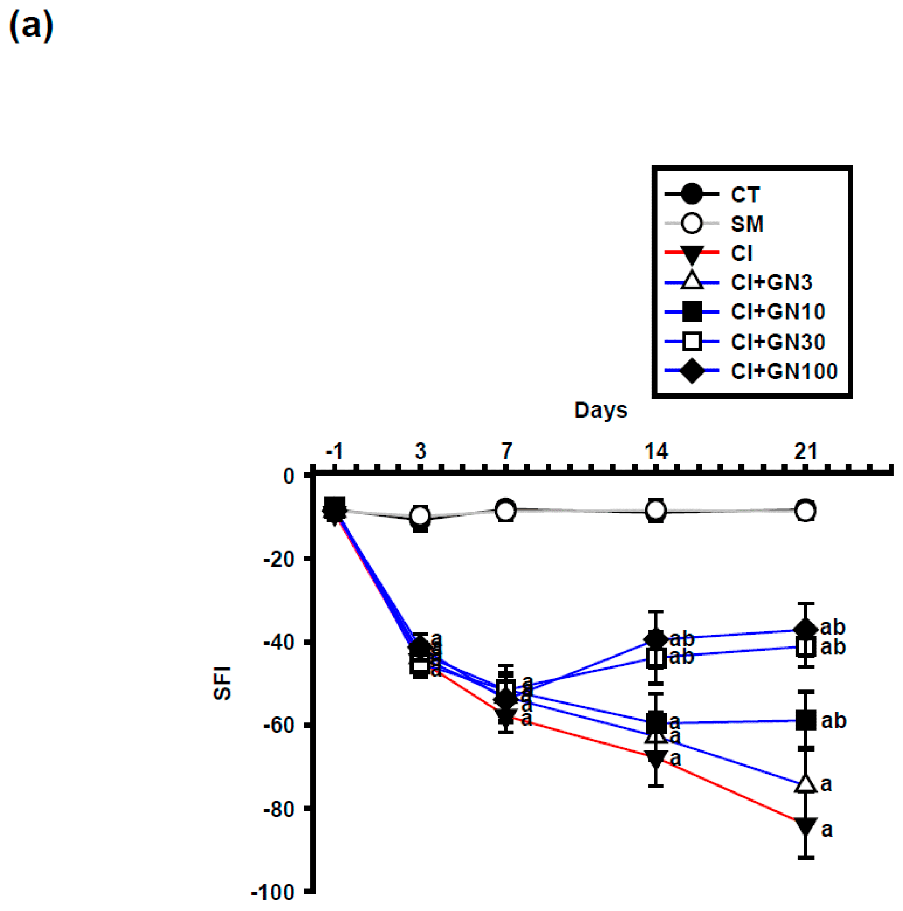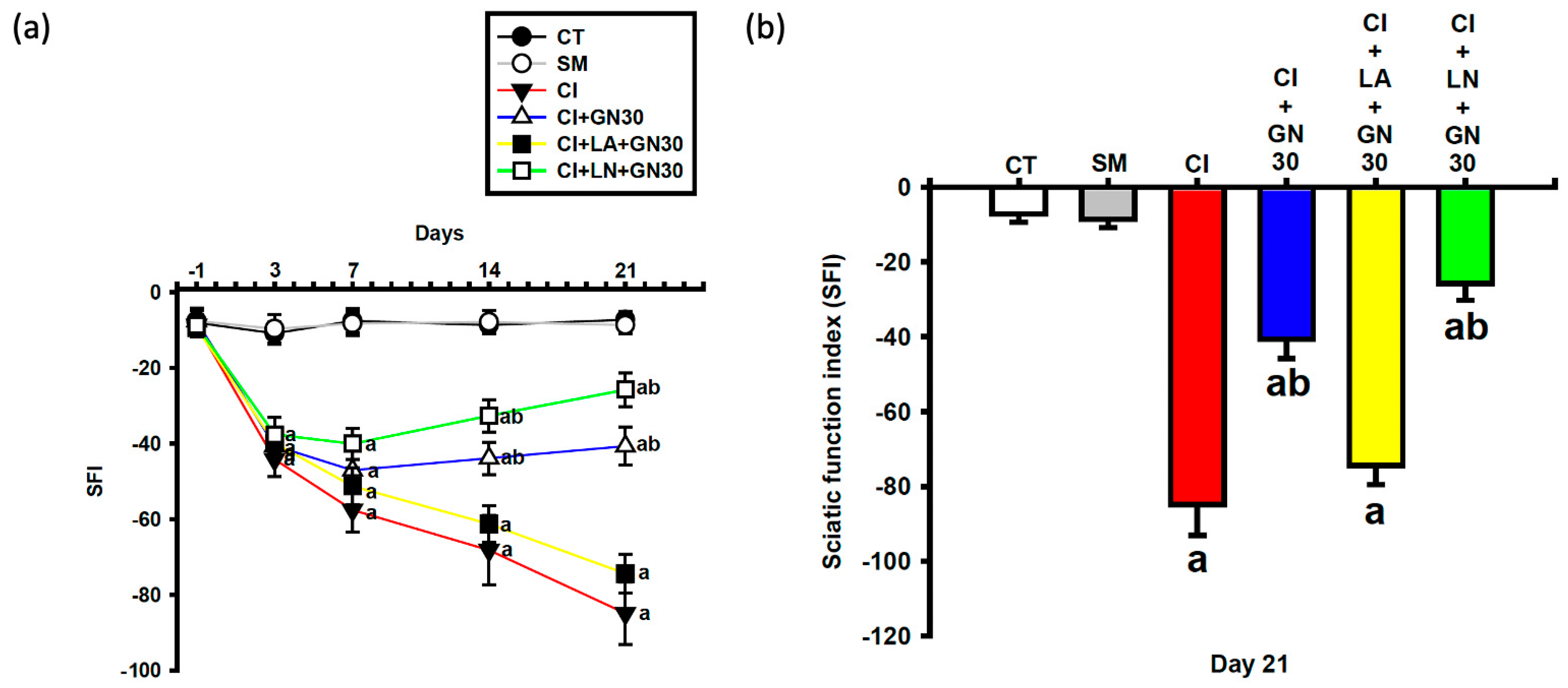 CCI caused a progressive deterioration of sciatic nerve function, reflected by a marked decline in the sciatic functional index (SFI) (