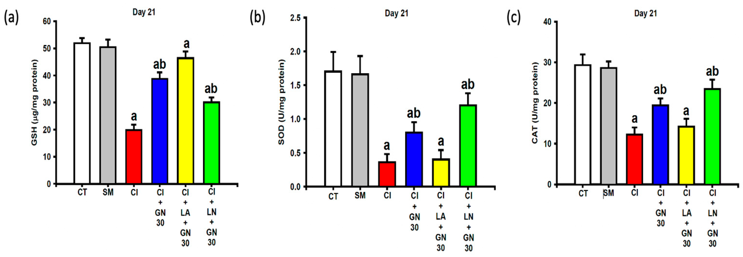 CCI resulted in substantial depletion of endogenous antioxidant defenses, including glutathione (GSH), superoxide dismutase (SOD), and catalase (CAT) activities (