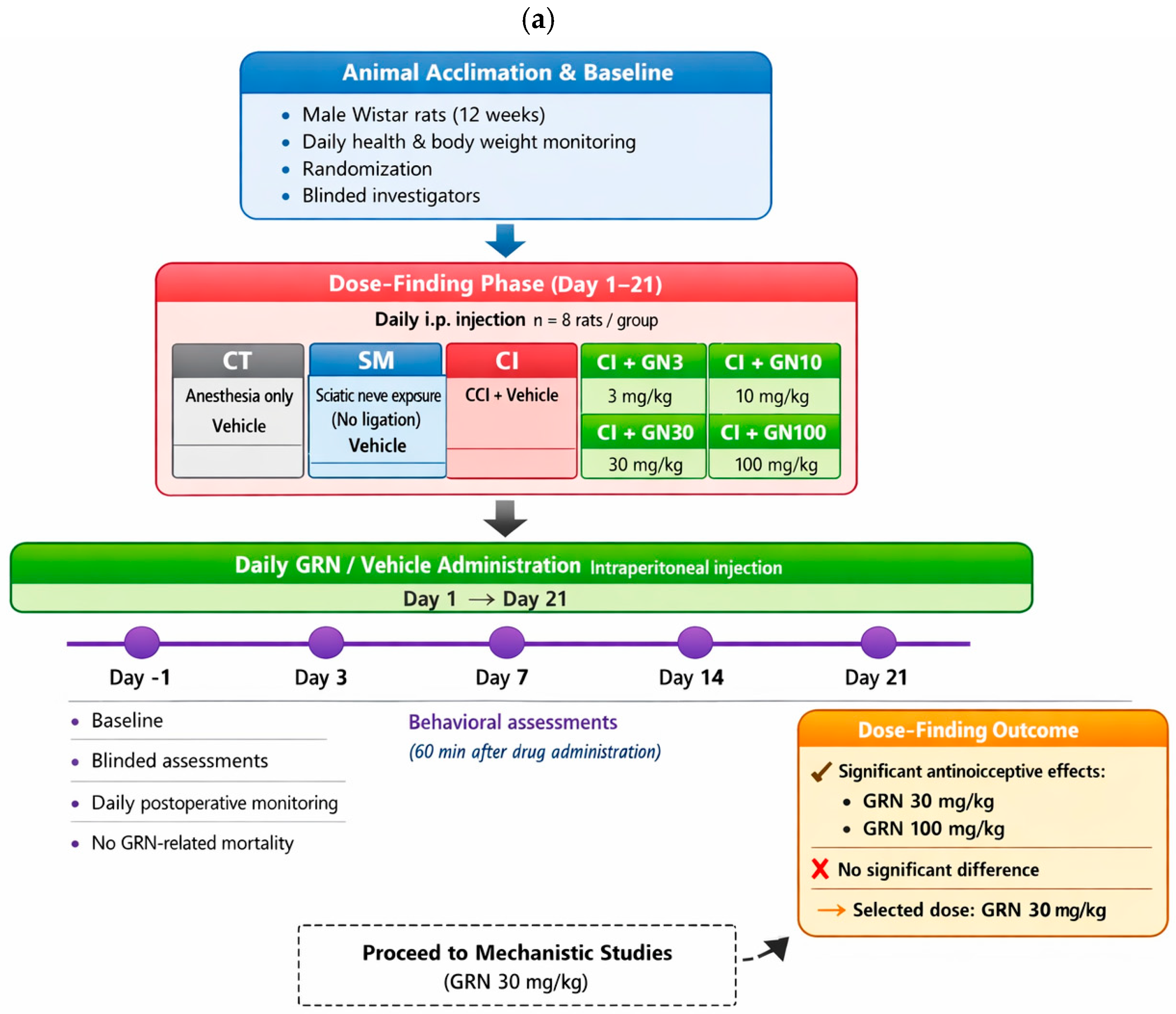 Behavioral assessment at day 21 demonstrated robust antinociceptive efficacy at GRN doses of 30 and 100 mg/kg, with no significant difference between these two doses. Based on these results, 30 mg/kg was selected as the optimal dose for subsequent mechanistic studies.