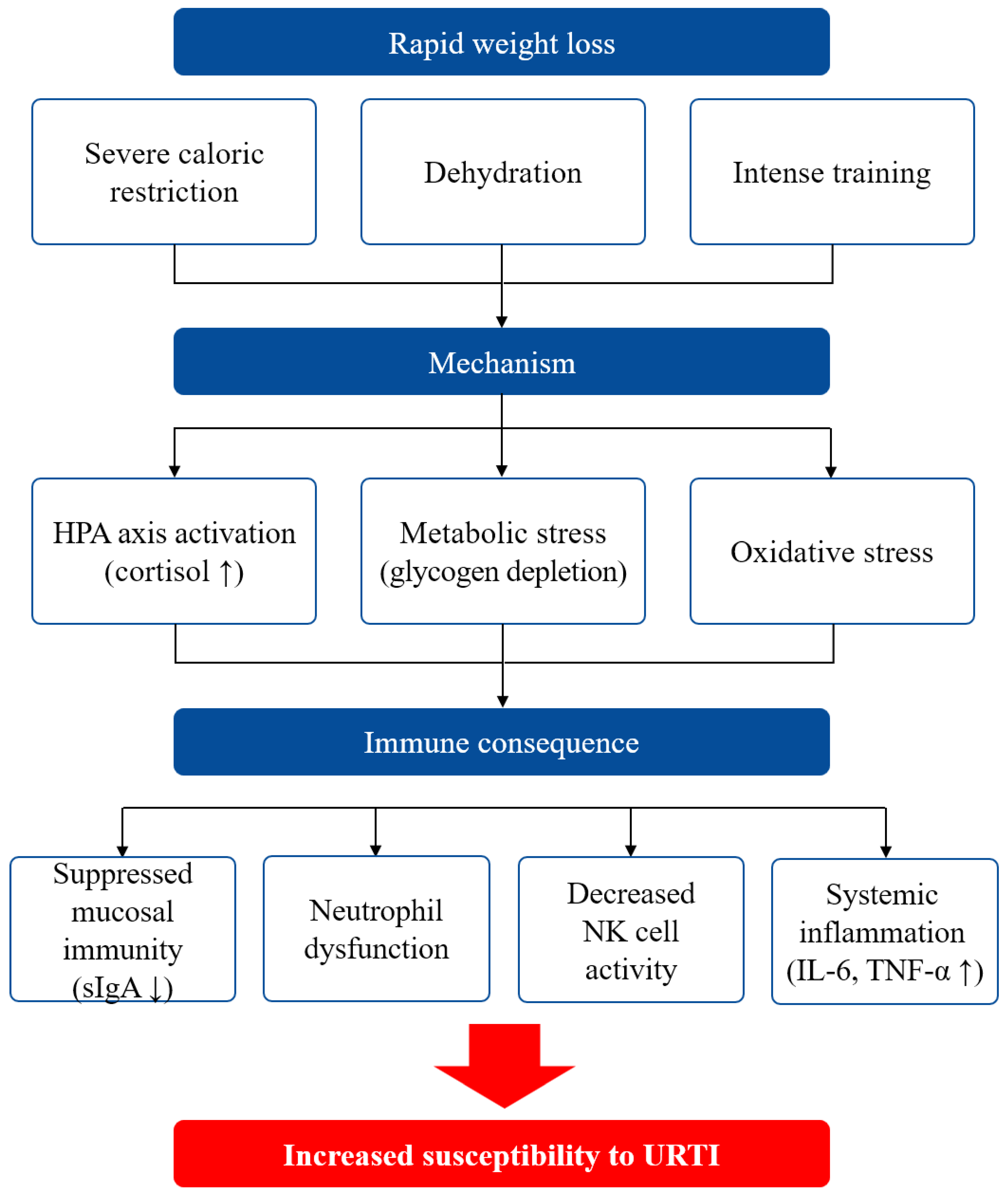 | Systemic inflammation | IL-6, TNF-α ↑ (glycogen depletion → muscle IL-6 release) | Caloric restriction + dehydration | URTI risk ↑ (chronic dysregulation; delayed recovery) | [4,13,30] |