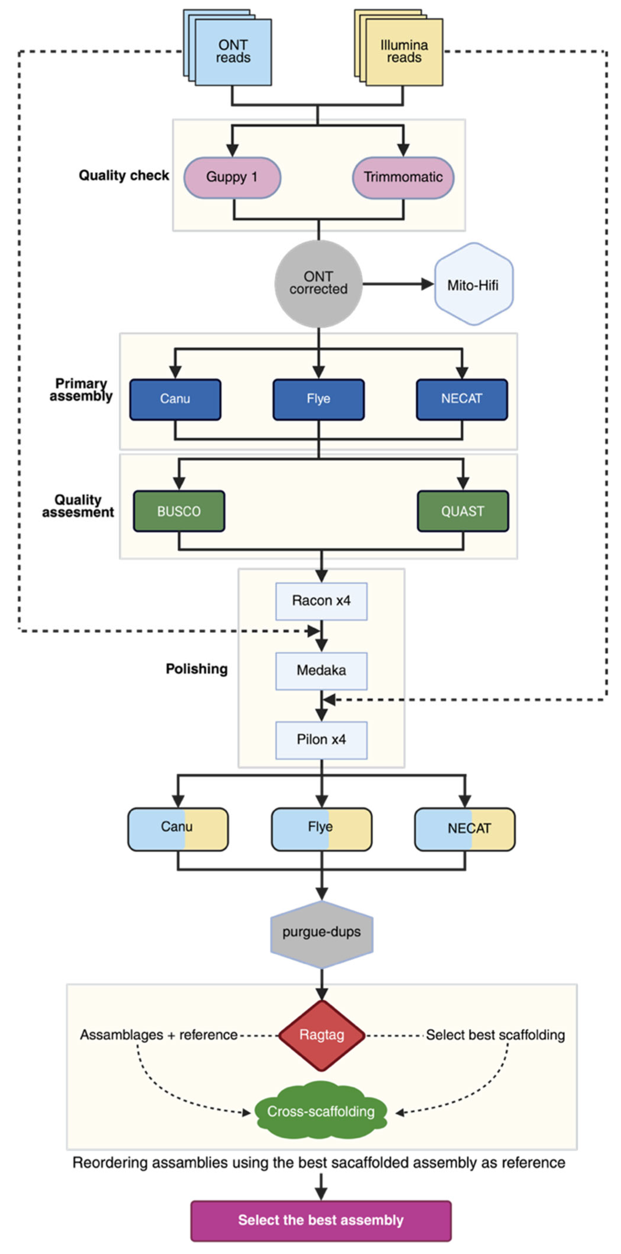 - Racon + Medaka + Pilon (R+M+P): A hybrid approach where Racon and Medaka are first used to improve the long-read consensus, followed by Pilon with short reads for fine base-level correction.