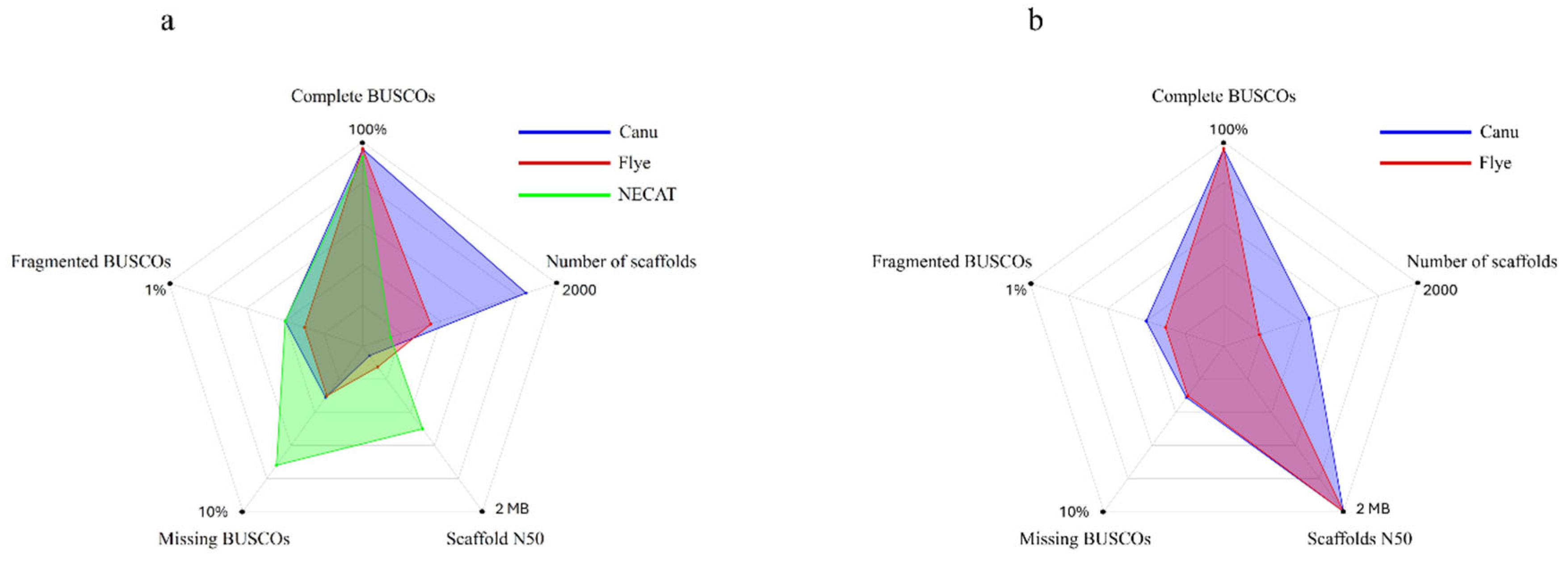 | Complete BUSCOs (%) | 92.6 (S: 90.6, D: 1.9) | 96.3 (S: 94.0, D: 2.7) | Flye more complete |