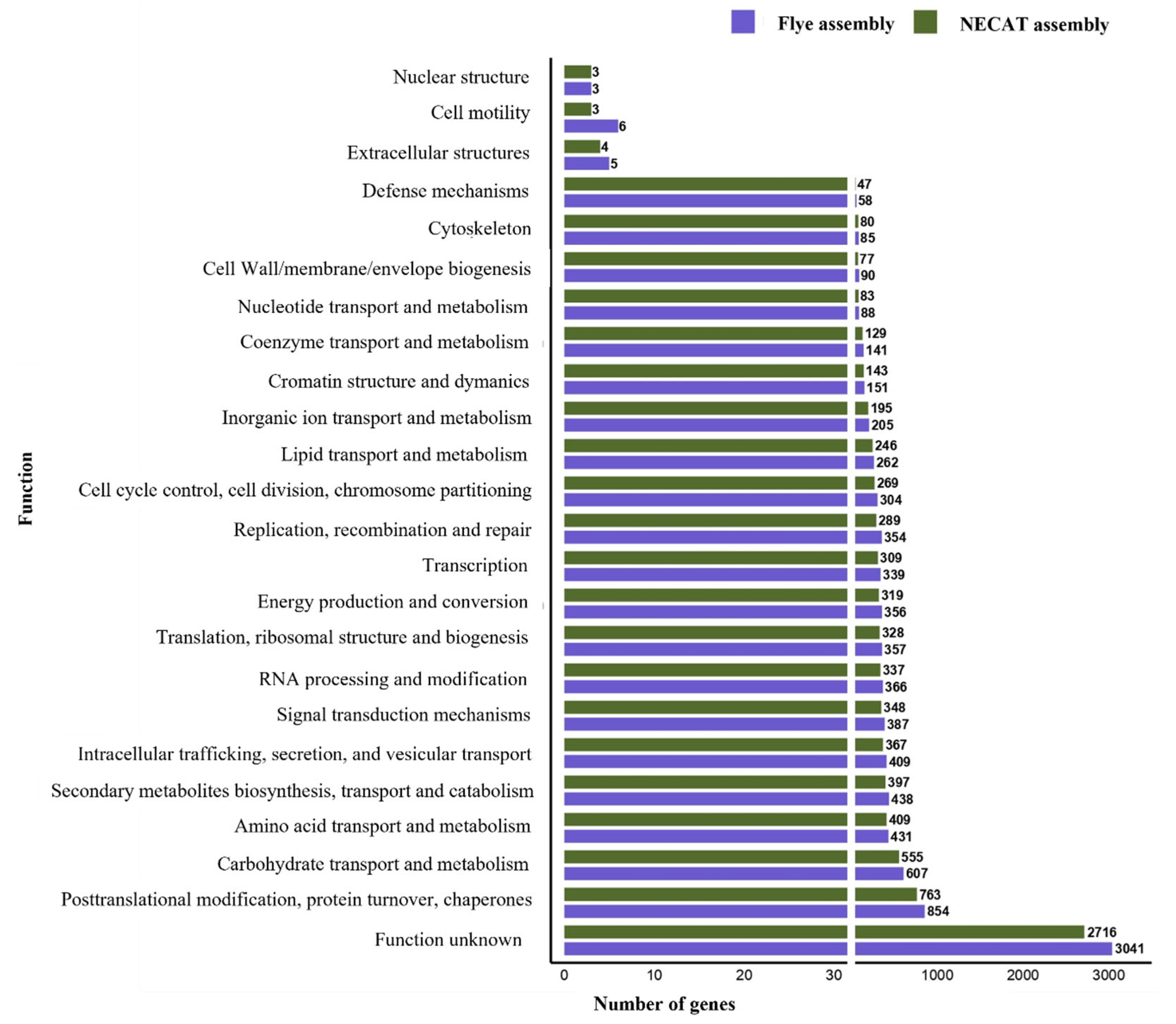 | Number of Genes | 15, 550 | 13, 481 | Flye predicts +2069 genes |