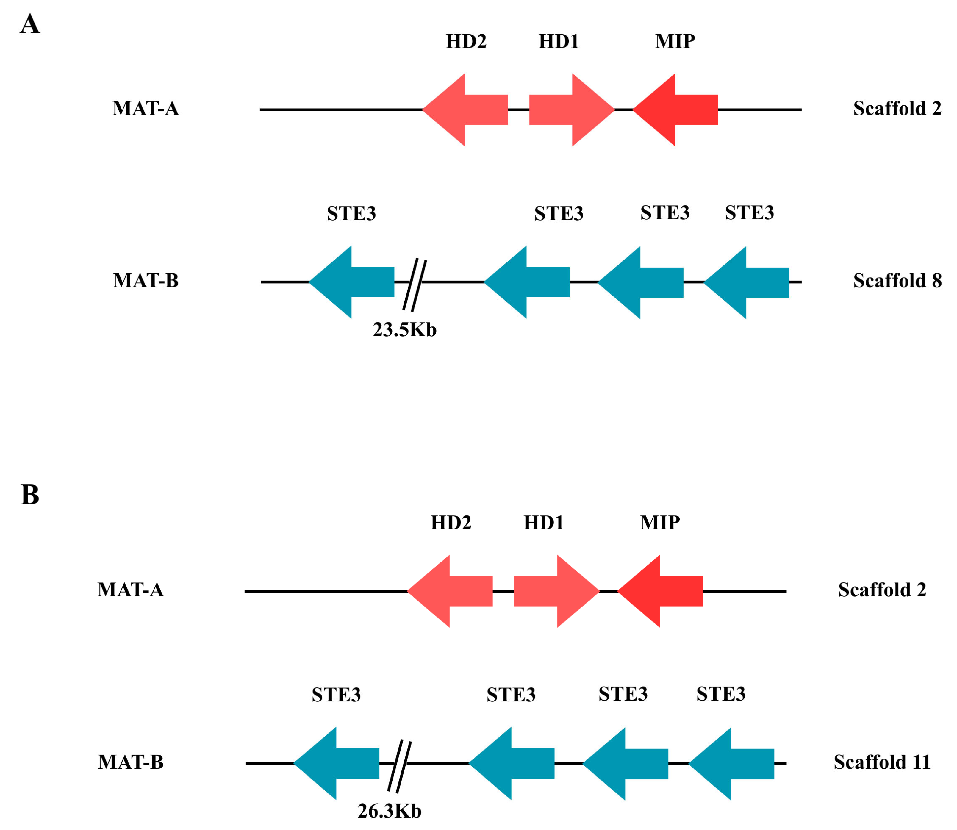 - Chu, C.; Li, D.; Gu, L.; Yang, S.; Liu, C. Evidence for the existence of mating subtypes within the Schizophyllum commune: Mating behavior and genetic divergence. J. Fungi 2025, 11, 277. [Google Scholar] [CrossRef]