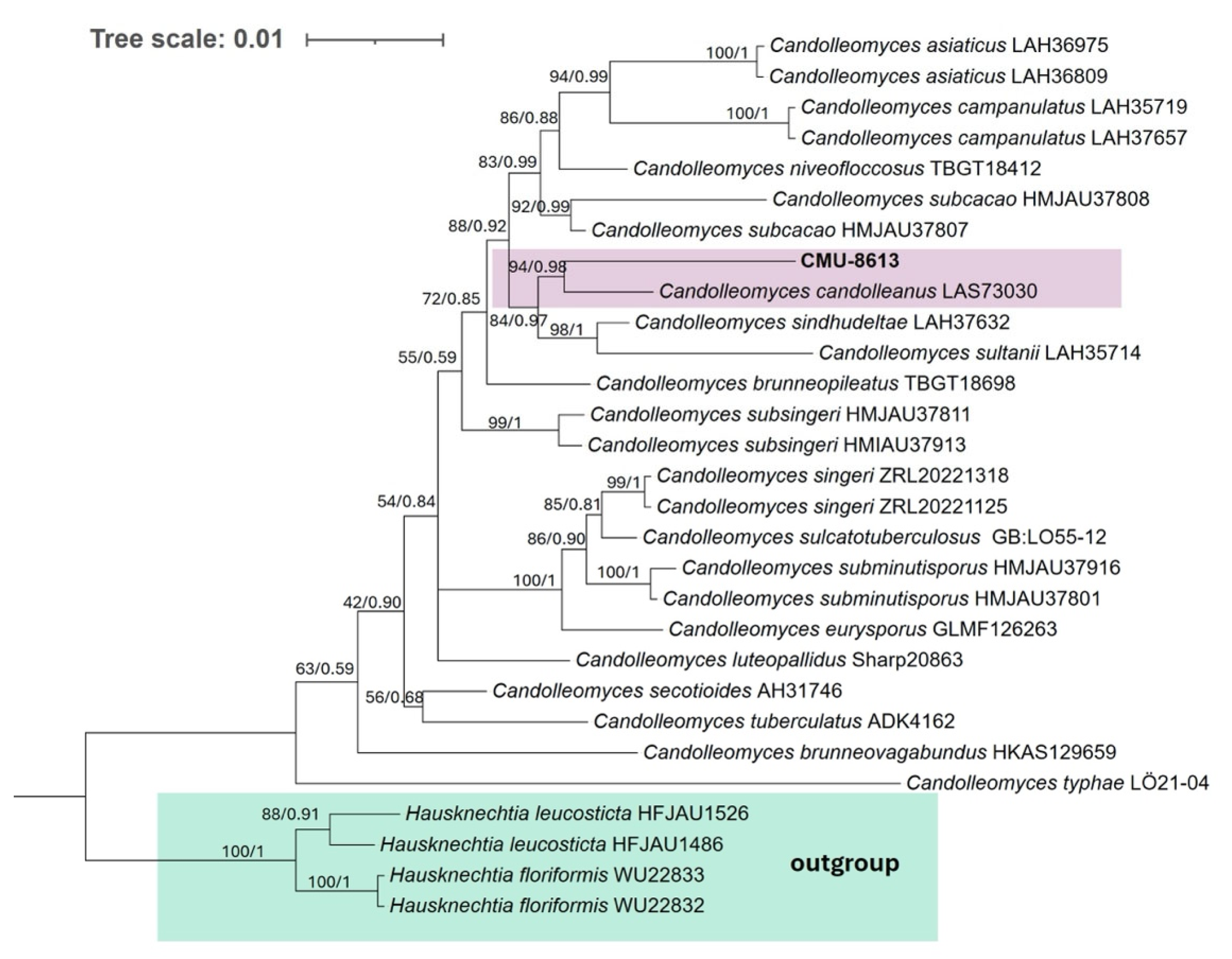 - Han, X.X.; Phurbu, D.; Ma, G.F.; Li, Y.Z.; Mei, Y.J.; Liu, D.M.; Cao, B. A taxonomic study of Candolleomyces specimens from China revealed seven new species. J. Fungi 2024, 10, 499. [Google Scholar] [CrossRef] [PubMed]