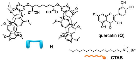 Bis-pillar[5]arene H was prepared according to a literature procedure [48]. Quercetin (>95% HPLC), cetyltrimethylammonium bromide (CTAB), deuterium oxide, chloroform-d3, HPLC-grade chloroform, Dulbecco’s Modified Eagle Medium (DMEM), inactivated bovine serum, penicillin G, streptomycin, trypsin, phosphate buffer (PBS), 3-(4,5-dimethylthiazol-2-yl)-2,5 diphenyltetrazolium bromide (MTT), 2,2-diphenylpyrylhydrazyl (DPPH), FeCl3, 2,4,6-tris(2-pyridyl)-s-triazine (TPTZ), hydrochloric acid, 2,2′-azino-bis-(3-ethylbenzothiazoline-6 sulphonic) acid (ABTS●+), 2,2-dimethyl-2-silapentane-5-sulfonate sodium salt (DSS), ammonium peroxydisulfate, dimethyl sulfoxide (DMSO, puriss. p.a., dried ≤0.02% water), HPLC-grade water, HPLC-grade acetonitrile, HPLC-grade methanol were supplied by Merck Life Science s.r.l., Milan, Italy, and used as received. Murine fibroblast NIH-3T3 cells (cat. no. CRL-1658) were purchased from ATCC, Rockville, MD, USA. NMR spectra were recorded at 25 °C in D2O or CDCl3 on a Varian 500 MHz instrument (Palo Alto, CA, USA) equipped with a broadband pulse-field gradient probe. Chemical shifts are reported in ppm and are referenced to the CHCl3 residual solvent peak (δ = 7.26 ppm) or to 2,2-dimethyl-2-silapentane-5-sulfonate sodium salt (DSS) as an external standard. 1H NMR spectra in D2O were recorded using a solvent suppression pulse sequence (PRESAT).