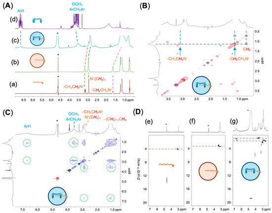 (Panel (A)): 1H NMR spectra (500 MHz, D2O, 25 °C) of (a) [CTAB] = 0.9 mM, (b) SNPs of [CTAB] = 0.9 mM and (c) CTAB/H SNPs ([CTAB] = 0.9 mM, [H] = 0.4 mM); (d) 1H NMR spectrum (500 MHz, CDCl3, 25 °C) of [H] = 5 mM. (Panel (B)): section of the 2D TOCSY NMR spectrum (500 MHz, D2O, 25 °C) of CTAB/H SNPs ([CTAB] = 0.9 mM, [H] = 0.4 mM). (Panel (C)): 2D NOESY NMR spectrum (500 MHz, D2O, 25 °C) of CTAB/H SNPs ([CTAB] = 0.9 mM, [H] = 0.4 mM). (Panel (D)): sections of the DOSY plots and the 1H NMR spectra (500 MHz, 25 °C, D2O) of (e): [CTAB] = 0.9 mM; (f) SNPs of [CTAB] = 0.9 mM, and (g) CTAB/H SNPs ([CTAB] = 0.9 mM, [H] = 0.4 mM). * Asterisks indicate the suppressed HDO solvent peak.