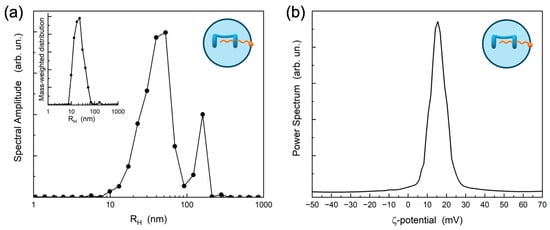 (a) Intensity-weighted size distribution at the scattering angle of 90° (the size distributions at different scattering angles were analogous) and (b) ζ-potential of CTAB/H SNPs. The inset of plot (a) displays the mass-weighted size distribution obtained by using the Mie scattering model [60].