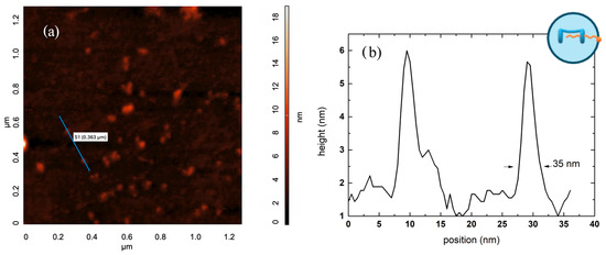 Morphological analysis was carried out using Atomic Force Microscopy (AFM) [49]. The resulting surface morphology (Figure 4a) shows well-defined, flattened nanoparticles with an approximately circular shape, whose lateral size ranges from about 20 to 50 nm. The nanostructures exhibit a maximum height of about 5–6 nm, indicating that they are colloidal nanoparticles whose typically spherical shape was altered (i.e., collapsed) during the dehydration process required for AFM sample preparation. Figure 4b displays the line profile acquired along the path drawn in Figure 4a, highlighting the presence of particles with an average lateral size of about 25 nm. As expected for this type of sample, a distribution in particle sizes is observed, consistent with its intrinsic nature. It is important to note that the line-profile analysis only probes a limited number of nanoparticles, which may not provide a statistically representative sample of the entire surface. Notably, the lateral size distribution exhibits a tail extending toward larger diameters, with values approaching ~70–90 nm (Figures S2 and S3). This observation supports the consistency between AFM and DLS measurements, as these larger lateral dimensions are compatible, considering particle flattening, with the hydrodynamic size obtained from DLS (hydrodynamic radius ~40 nm).