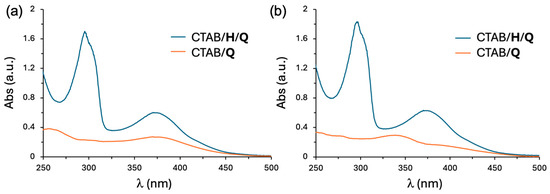 UV/Vis spectra of: (a) CTAB/H/Q ([CTAB] = 6.00 × 10−5 M; [H] = 2.67 × 10−5 M; [Q] = 2.11 × 10−5 M) and CTAB/Q ([CTAB] = 6.00 × 10−5 M; [Q] = 9.43 × 10−6 M) formulation freshly prepared and (b) the same CTAB/H/Q and CTAB/Q formulations after 7 days.