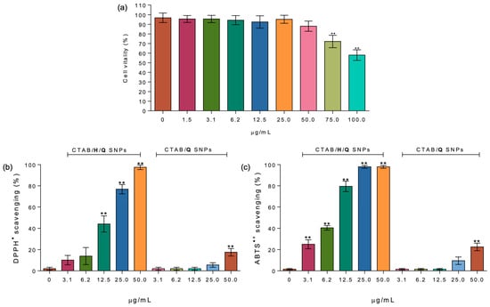 (a) Cytotoxicity assays. Viability of NIH-3T3 cells after 24 h incubation with different concentrations of CTAB/H SNPs. Cell viability was determined using the MTT assay. Data are expressed as mean ± SD, with asterisks (**) indicating significant statistical difference at p < 0.05. (b) Antioxidant activity of CTAB/H/Q SNPs against DPPH. (c) Antioxidant activity of CTAB/H/Q SNPs against ABTS radical. Statistical analysis was performed using one-way analysis of variance (ANOVA) and the significance of differences from respective controls was assessed using Dunnett’s test.
