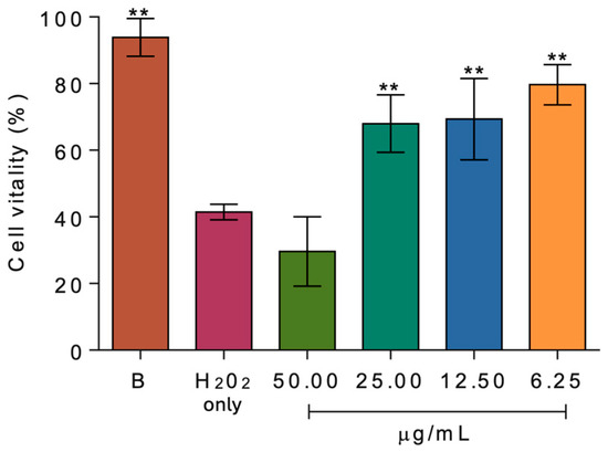 The assay was carried out by following the procedure described by Lin et al. [71]. 200 μL of NIH-3T3 cells was seeded into 96-well plates at a density of 1 × 104 cells/well. Following a 24 h incubation and attachment, cells were pretreated with varying concentrations (6.25, 12.50, 25.00, and 50.00 μg/mL) of CTAB/H/Q SNPs for 2 h, followed by induction of cellular damage with H2O2 (800 μM) for 5 h. After incubation, the medium was carefully aspirated, and cells were washed three times with 200 µL of PBS (20 mM, pH = 7.3). Cells were then incubated for an additional 3 h with DMEM (without serum) containing 0.01% MTT (final concentration). After incubation, the medium was aspirated and the MTT crystals dissolved with 100 µL of DMSO. The plates were then gently shaken to solubilize the formazan, and absorbance was measured at 570 nm [64] with a microplate reader. The cytotoxicity test was performed in quintuplicate biological replicates derived each from triplicate technical replicates and expressed as mean ± standard deviation (SD).