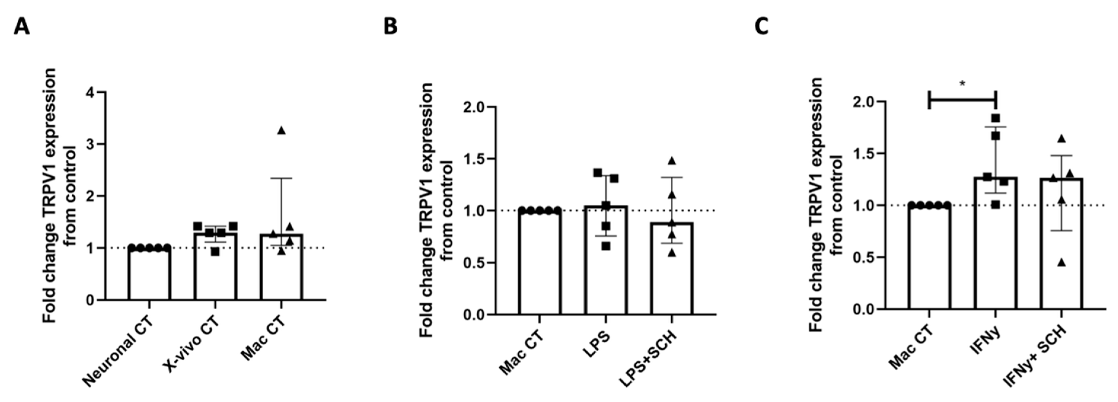2.5. IFNγ-Stimulated MDMs Produce Cytokines That Regulate TRPV1 Expression in iPSC-PSNs