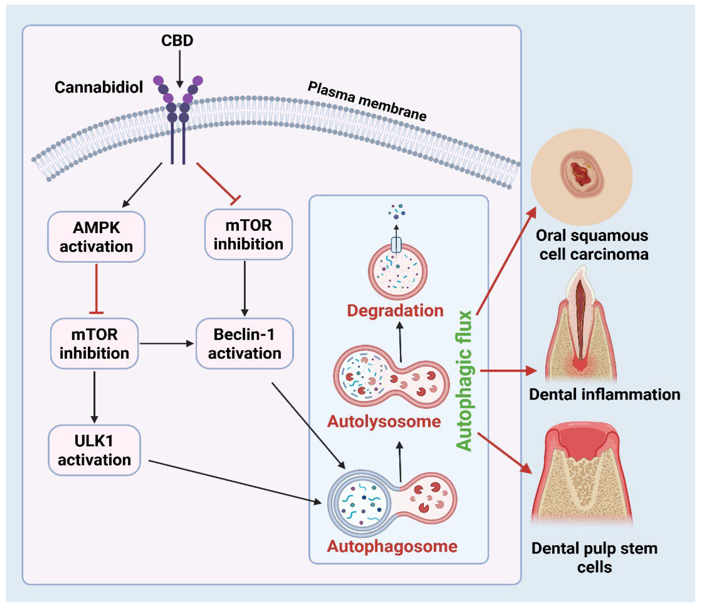 | CBD | mTOR, AKT | Inhibition → autophagy activation | OSCC, gingivitis | [64,88,89] |