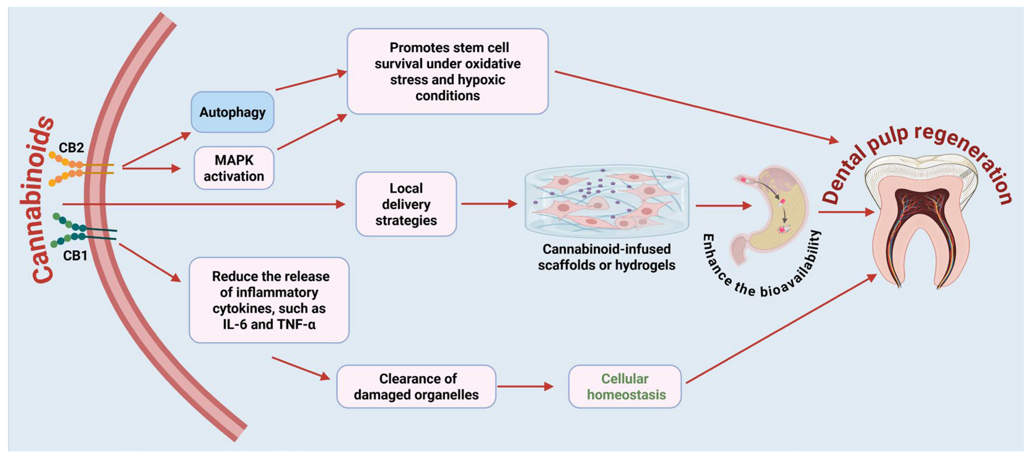 | Opioid Pathway | CB1/CB2 interact with μ-opioid receptors via shared GPCR signaling | Analgesia; reduced oral and periodontal pain | [43] |