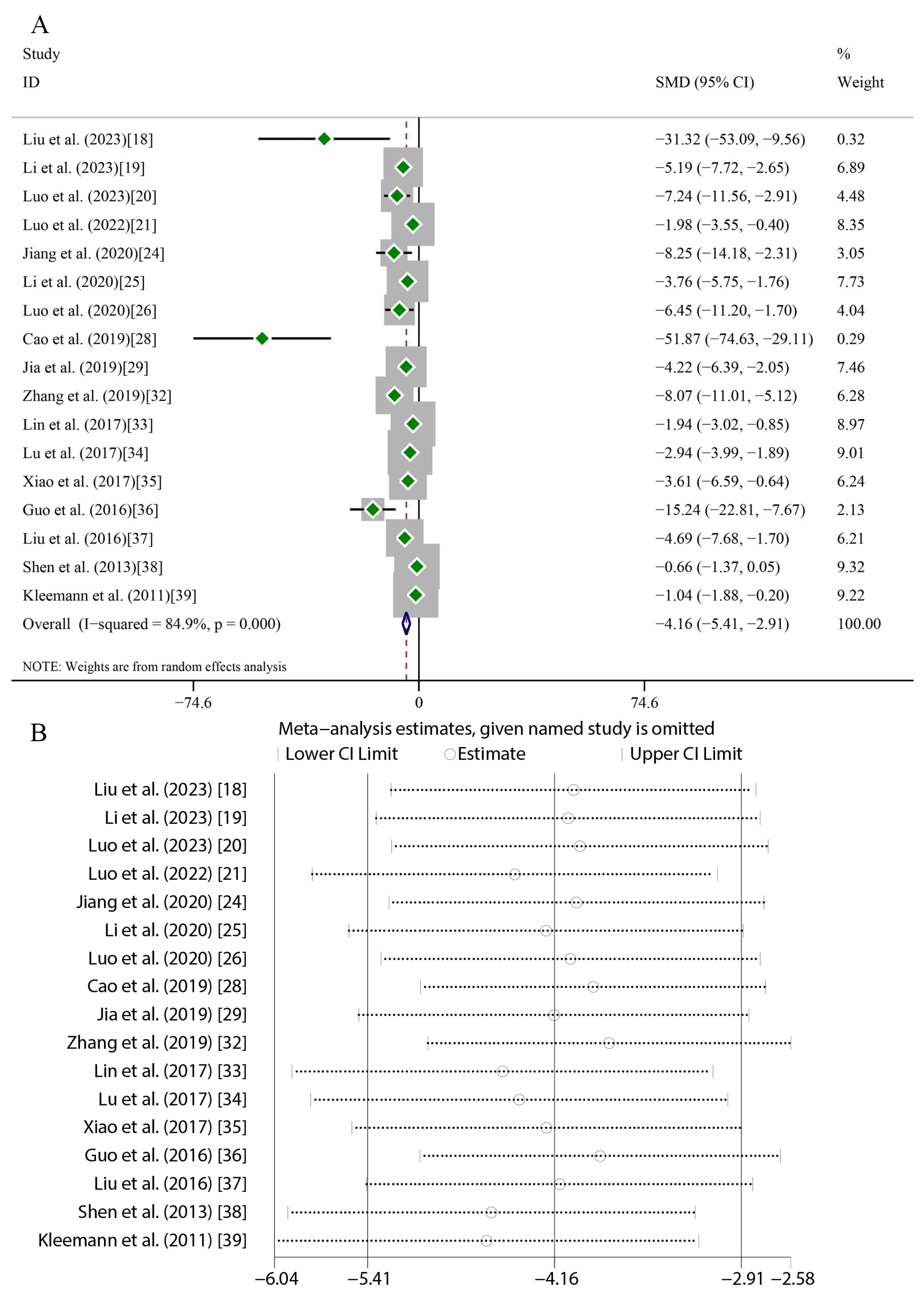 | MDA | 4 | 44/44 | 89.1 | <0.001 | −2.48 (−4.30, −0.66) | <0.01 |