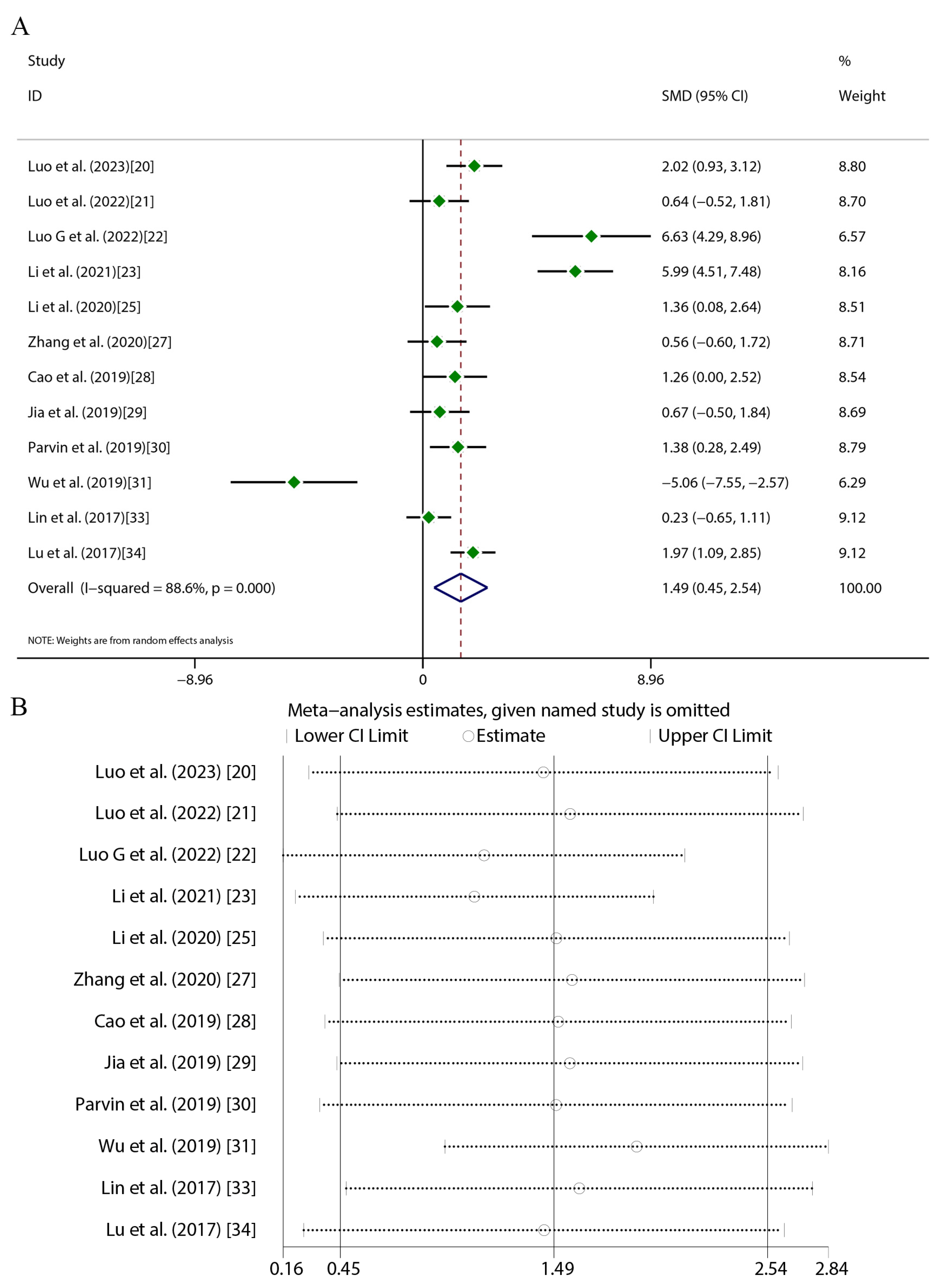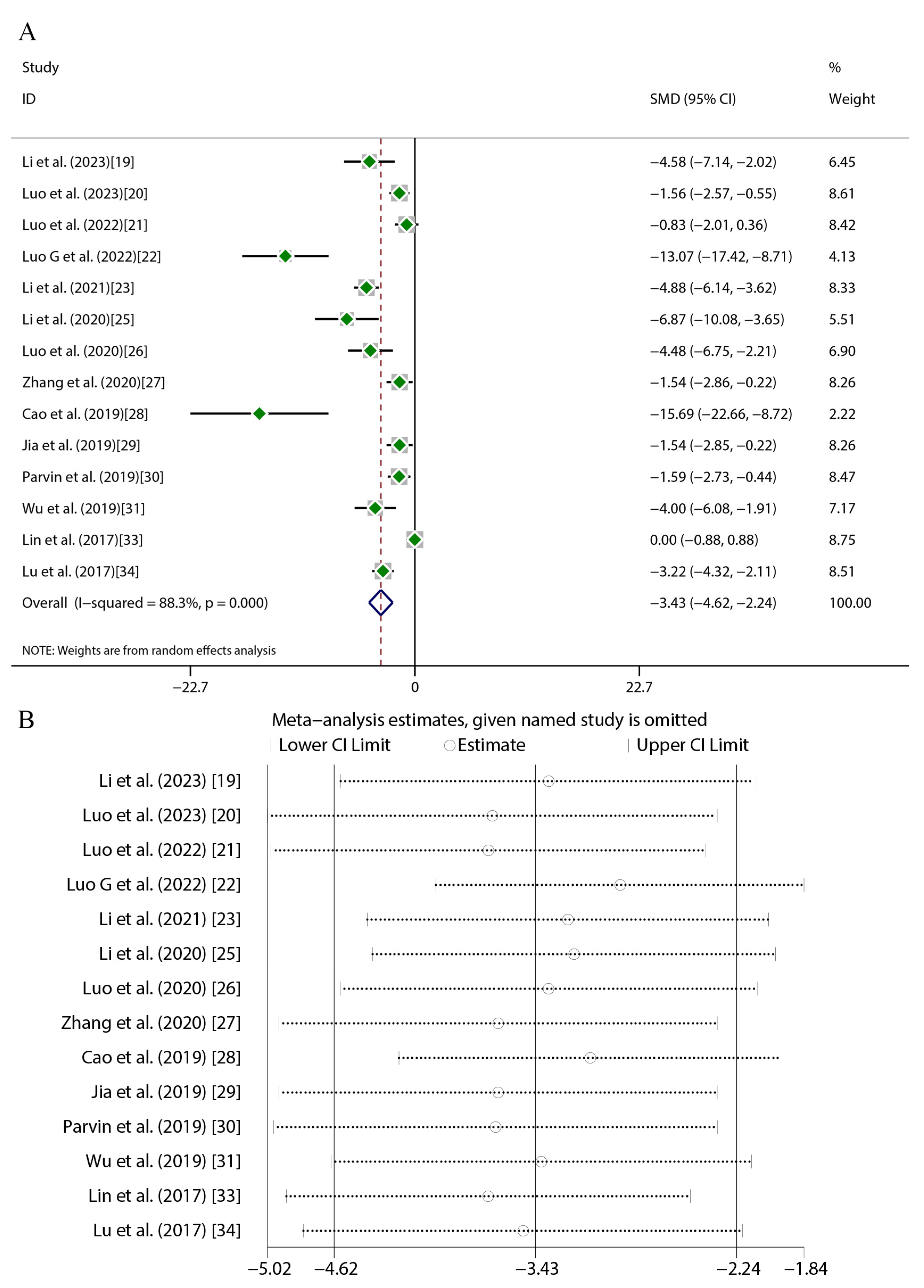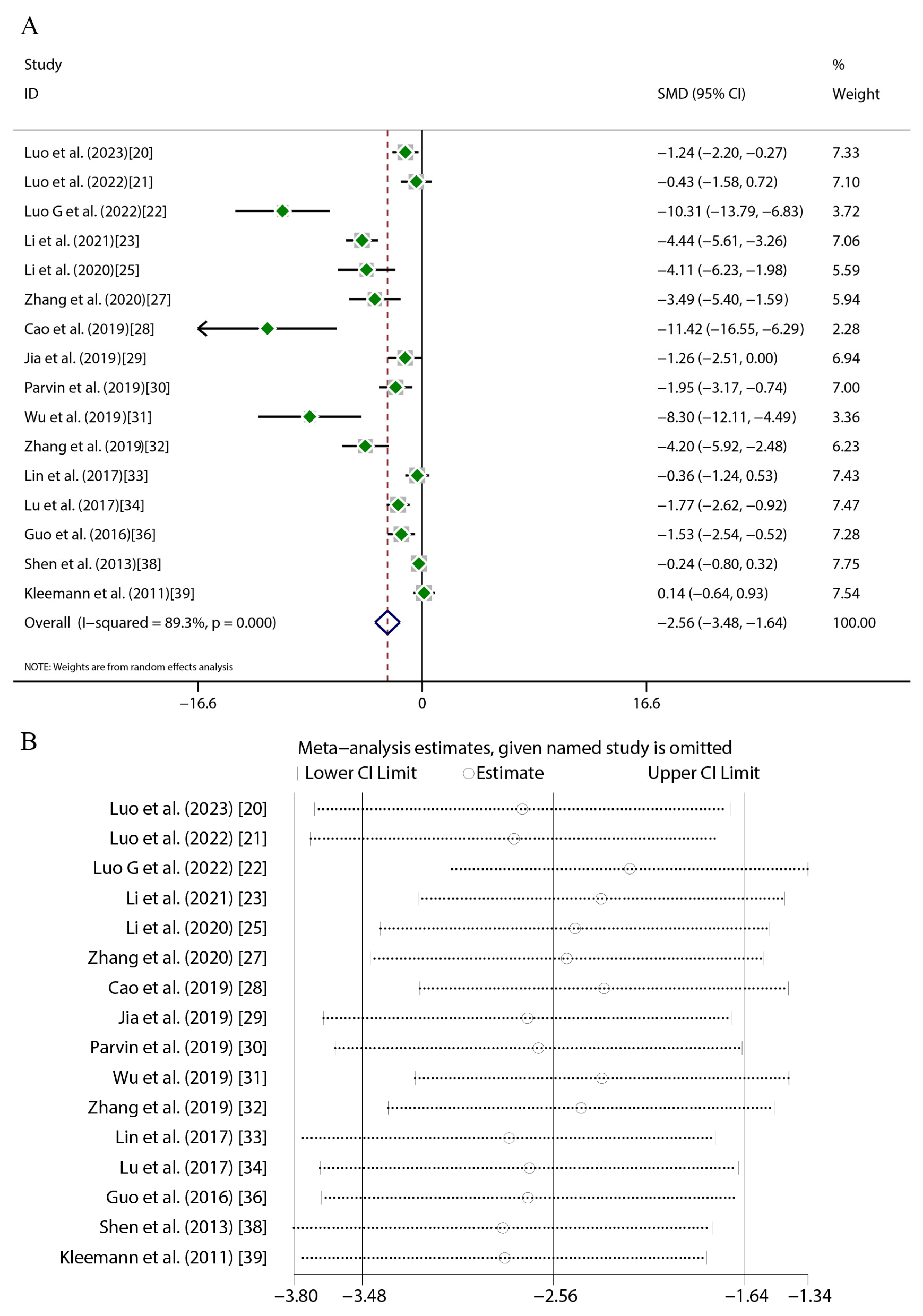 | SIRT1 | 3 | 15/15 | 56.0 | >0.05 | 3.24 (2.03, 4.46) | <0.01 |