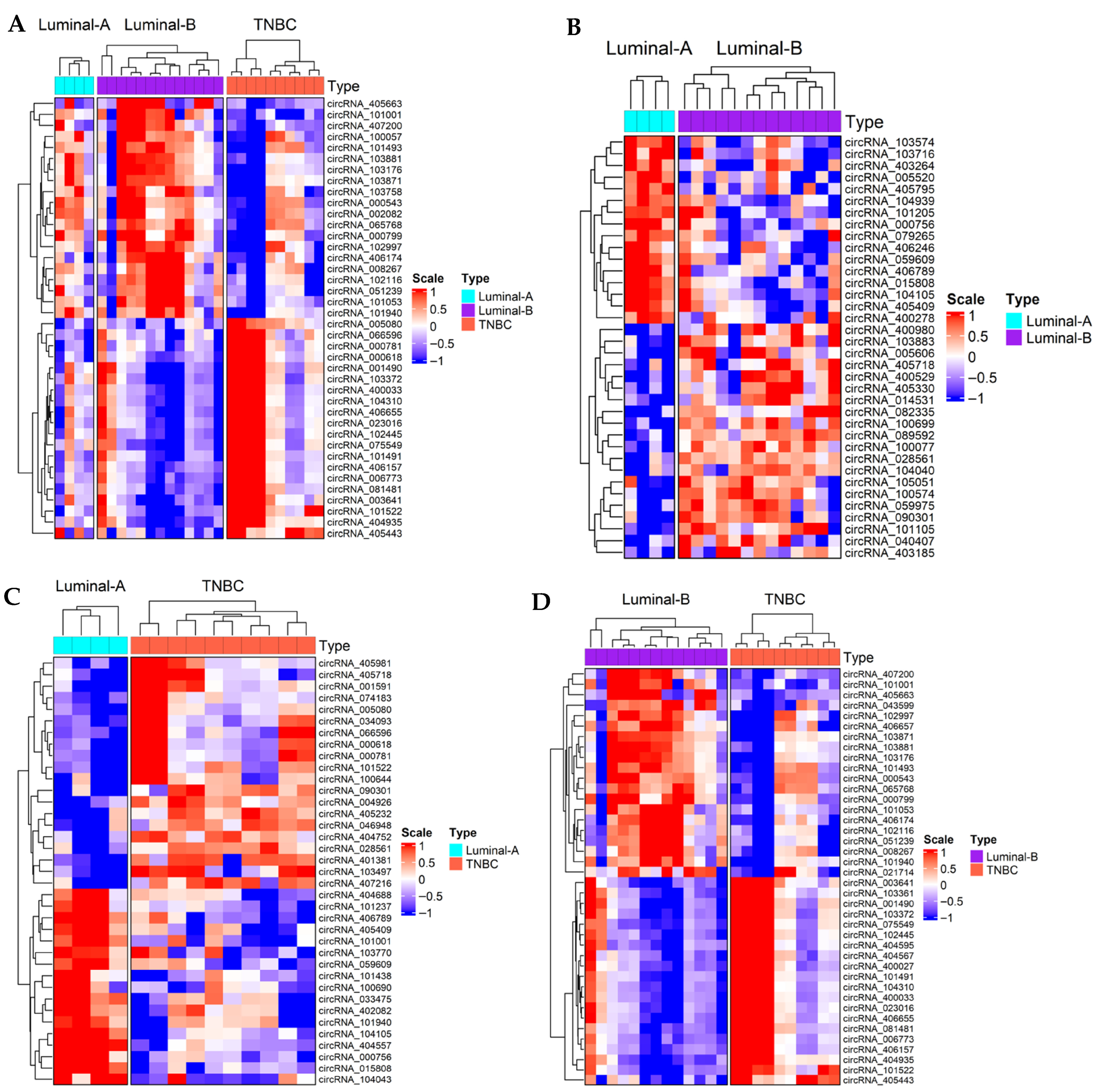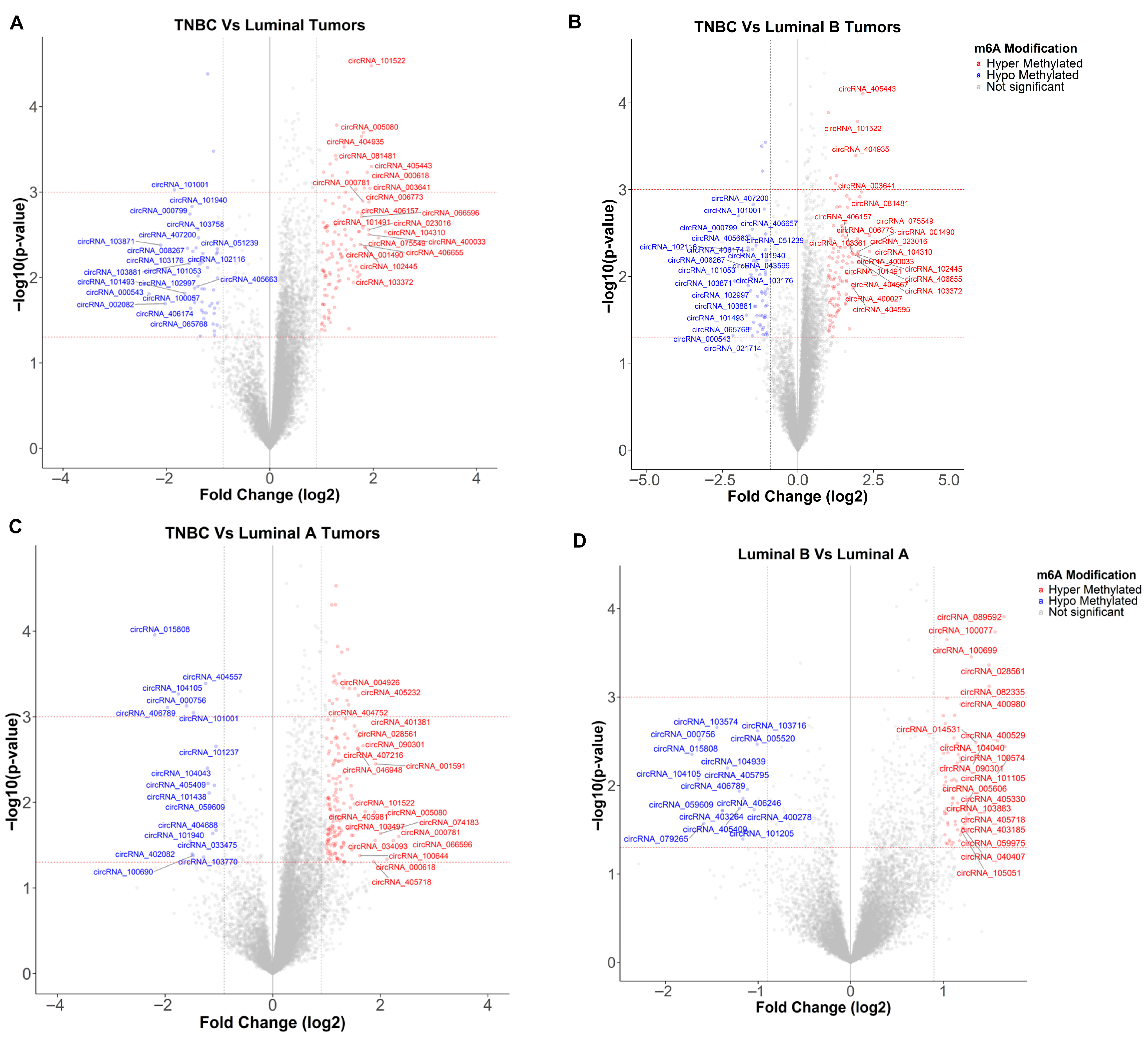 2.1. Identification of Differentially m6A-Modified circRNAs Between TNBC and Luminal Subtypes