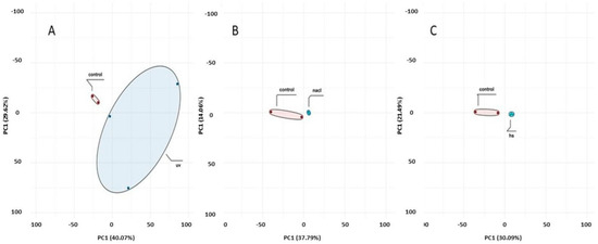 Principal component analysis (PCA) of transcriptomic profiles. PC1 and PC2 explained (A) 69.7% (UV vs. control), (B) 51.9% (NaCl vs. control), and (C) 51.6% (HS vs. control) of the variance.