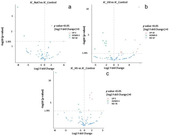 Differential gene volcano map. (a) NaCl vs. control, (b) UV vs. control, and (c) heat vs. control. The abscissa in is log2FoldChange, and the ordinate is -log10padj or -log10pvalue. The blue dashed line indicates the threshold line for differential gene screening criteria (a–c).