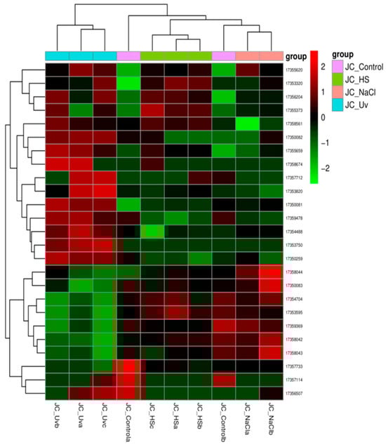 To compare transcriptional profiles across conditions, gene expression was quantified as FPKM and summarized per sample using boxplots (Figure 4). For biological replicates, the final FPKM for each gene was computed as the arithmetic mean across replicates. Global sample relationships were visualized via principal component analysis (PCA) of the expression matrix (Figure 5). Principal component analysis (PCA) revealed treatment-dependent shifts in global transcriptional profiles (Figure 5). PC1 and PC2 explained 51.6% (HS vs. control), 51.9% (NaCl vs. control), and 69.7% (UV vs. control) of the variance. While the separation between treated and control samples was most pronounced under UV exposure, a substantial proportion of the total variance resides in higher PCs. Therefore, PCA patterns should be interpreted as indicative of broad expression shifts rather than complete transcriptomic partitioning.