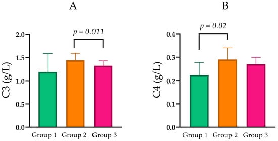 Levels of C3 were found to be parametric and are reported as mean ± SD. A statistically significant difference was observed between Group 2 (1.44 ± 0.32 g/L) and Group 3 (1.32 ± 0.33 g/L; p = 0.005; Figure 4A).