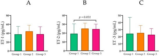 Additionally, endothelin levels (ET-1, ET-2, and ET-3) were further analyzed by stratifying the study population into subgroups based on normal or elevated levels of uric acid (UA), hsCRP, and IL-6. For UA analysis, comparisons were performed using sex-specific reference ranges.