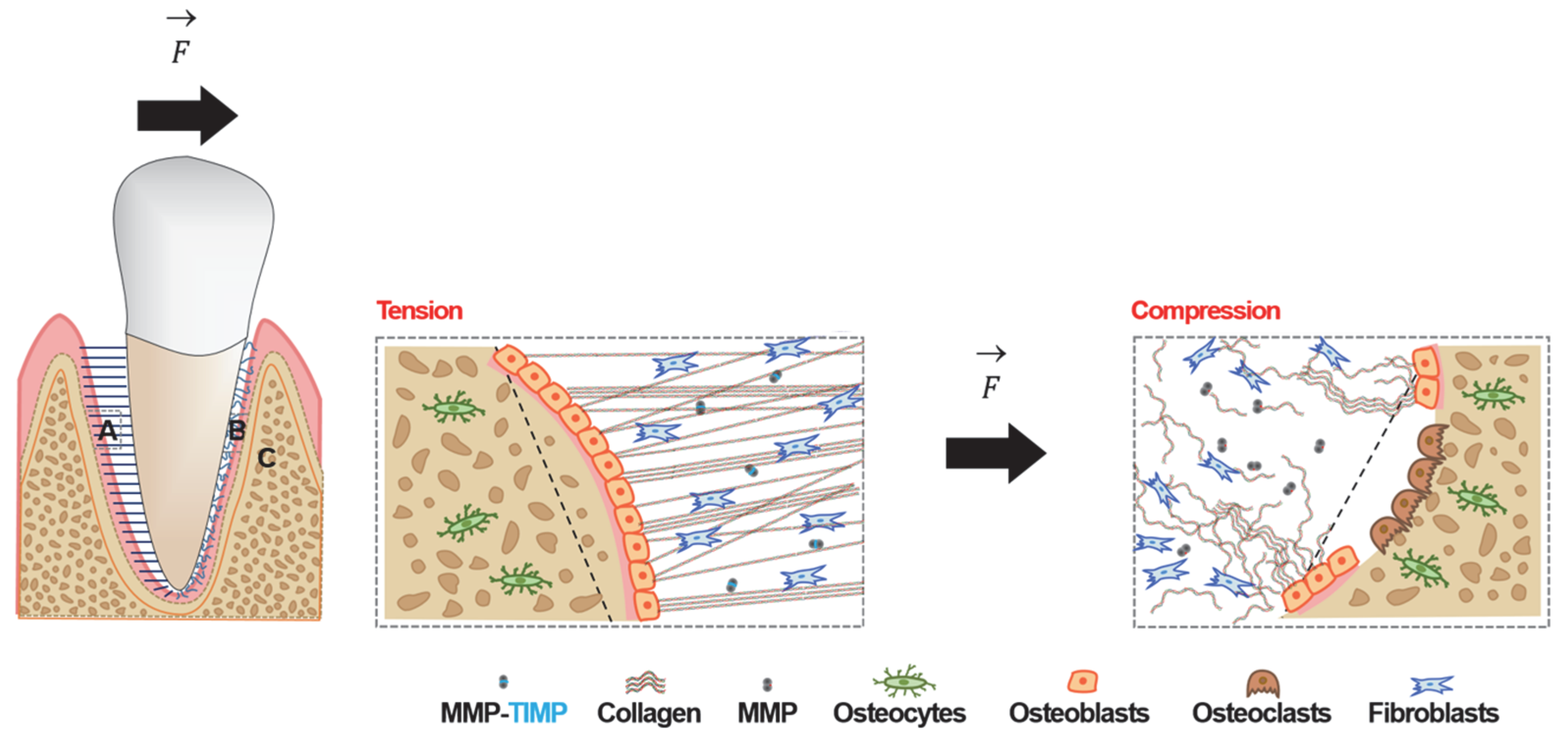 - Li, Z.; Yu, M.; Jin, S.; Wang, Y.; Luo, R.; Huo, B.; Liu, D.; He, D.; Zhou, Y.; Liu, Y. Stress Distribution and Collagen Remodeling of Periodontal Ligament During Orthodontic Tooth Movement. Front. Pharmacol. 2019, 10, 1263. [Google Scholar] [CrossRef] [PubMed]