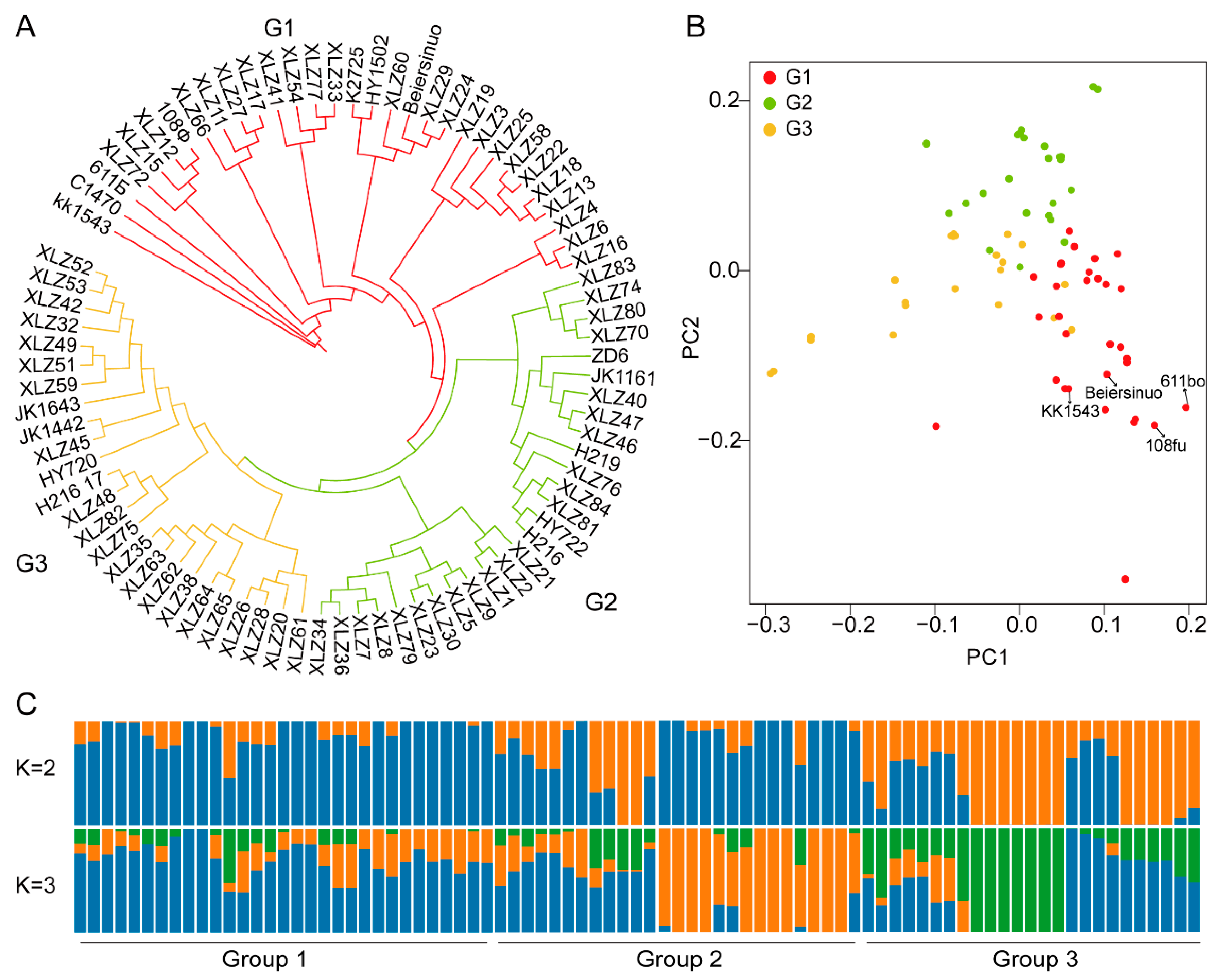 Figure 2. Clustering and population structure of cotton varieties in Northern Xinjiang. (A) Phylogenetic tree of early maturing varieties, different colors represent different groups (G1 to G3) (B) Principal component analysis. Different colors represent different groups. Arrows indicate important foreign-introduced parental lines. (C) Structure analysis with K = 2 and K = 3. The x-axis represents the different accessions. The orders and positions of accessions are consistent with those in the phylogenetic tree when K = 3.