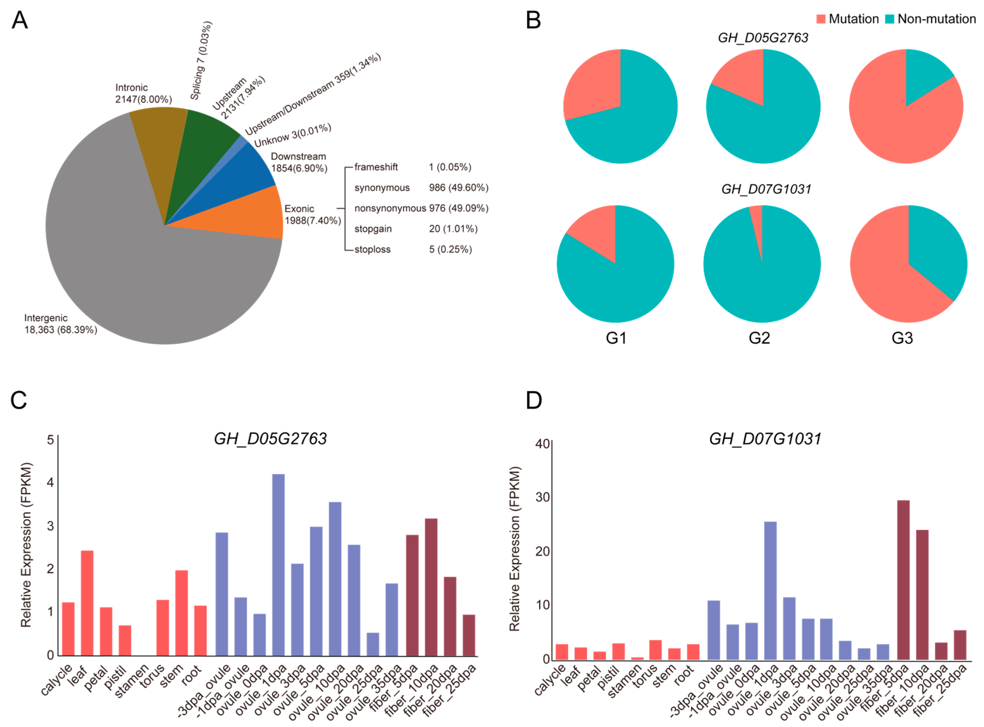 Figure 3. Genetic variation and expression profiles of GH_D05G2736 and GH_D07G1031. (A) Statistics of SNP annotation information (B) Proportional distribution of SNPs occurred in GH_D05G2736 and GH_D07G1031 across different cotton populations. The pie chart shows the percentage of SNPs among G1, G2 and G3 group. (C) Expression level of GH_D05G2736 in various tissues (D) Expression level of GH_D07G1031 in various tissues.