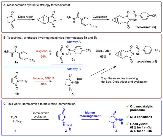(A) Most common pathway of tecovirimat synthesis, involving Diels–Alder cycloaddition and thermal cyclization of the imide system [8]. (B) Tecovirimat synthesis pathways involving maleimide intermediates 3a and 3b. (C) Mumm rearrangement (in blue) of hydrazide (1)-derived isomaleimides (2) to maleimides (3) as a general strategy explored in our study.