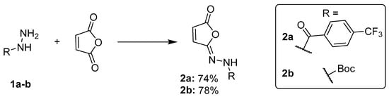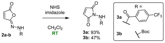 At first, the influence of the presence and type of substituent in the aromatic ring was examined (compounds 2c–2e and 3c–3e). Due to their potential applications in medicinal chemistry (e.g., synthesis of amines and sulfonamides), phenylhydrazine (compounds 2f and 3f) and benzenesulfohydrazide (compounds 2g and 3g) derivatives were included. We also tested one heterocyclic system, the tiophenecarbonyl hydrazide (compounds 2h and 3h). While the tiophenecarbonyl hydrazide 1h is a well-known medicinal chemistry building block [21,22], its isomaleimide (2h) and maleimide derivatives (3h) have not been described before.