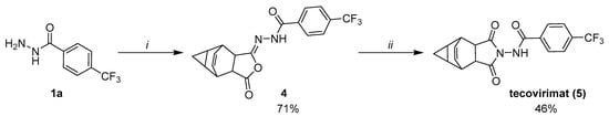 Synthesis of tecovirimat from maleimide 3a, according to reaction conditions described in the patent literature [17]. Reaction conditions: i—cycloheptatriene, anhydrous toluene, nitrogen atmosphere, 25 h and 110 °C.