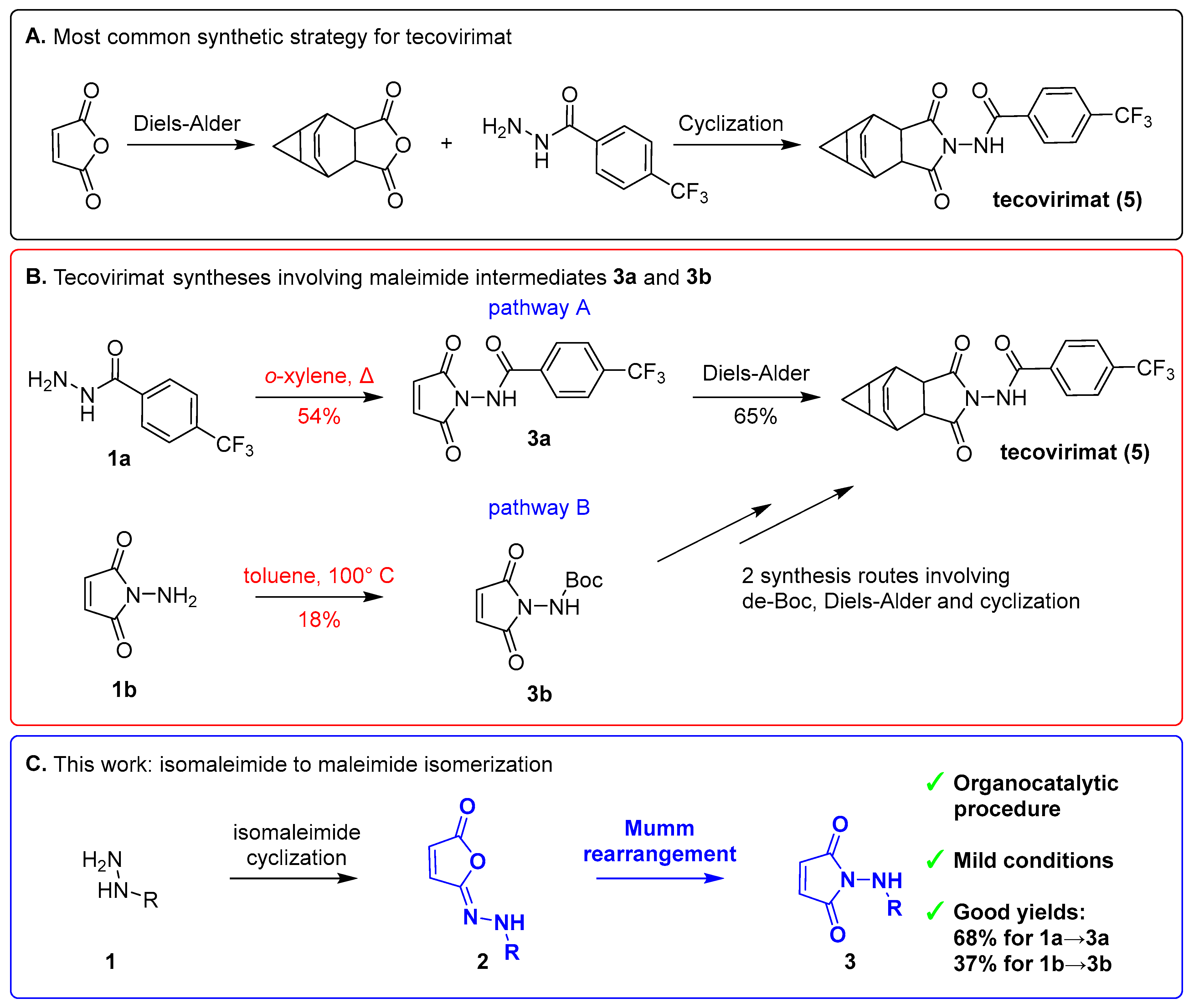 Szafrański, P.W.; Trybała, W.; Mazur, A.; Pańczyk-Straszak, K.; Kacprzak, A.; Canale, V.; Zajdel, P. Synthesis of Antiviral Drug Tecovirimat and Its Key Maleimide Intermediates Using Organocatalytic Mumm Rearrangement at Ambient Conditions. Int. J. Mol. Sci. 2026, 27, 61. https://doi.org/10.3390/ijms27010061