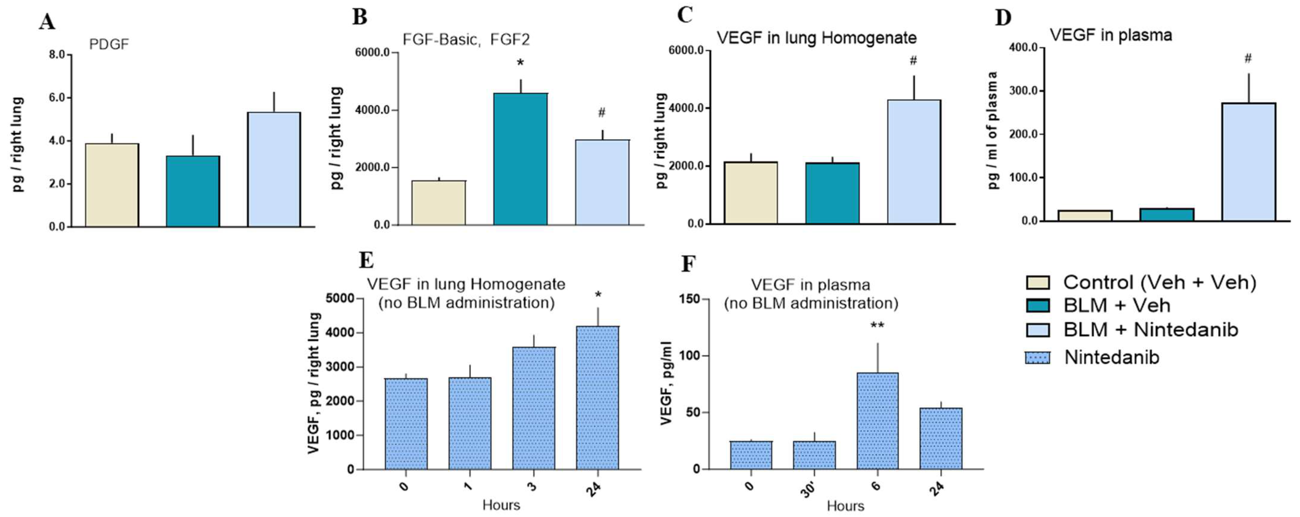 2.2.4. Effect of Nintedanib on Presumptive Targeted Growth Factors in Lung Homogenate Supernatant and Plasma