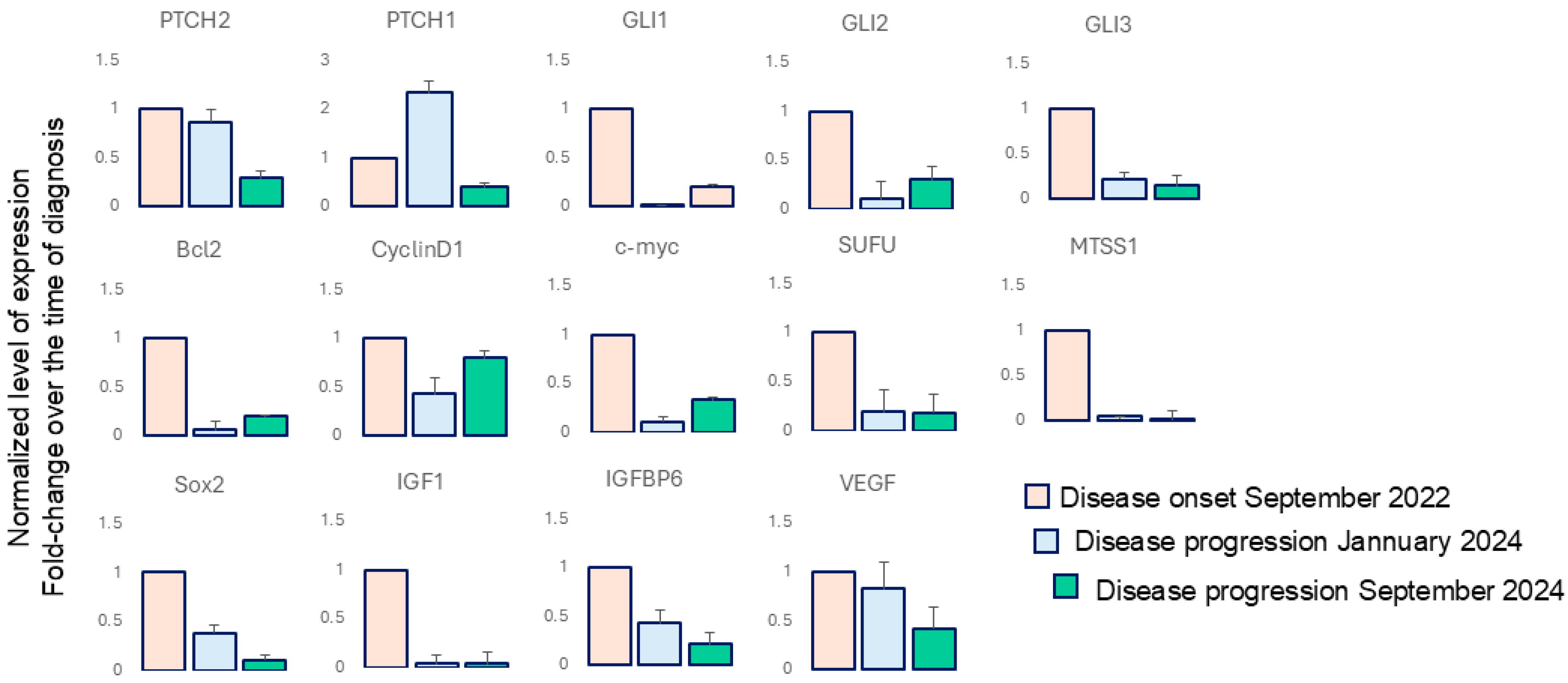 Papaccio, F.; Marrapodi, R.; Eibenschutz, L.; D’Arino, A.; Caputo, S.; Marini, A.; Scano, S.; Presaghi, A.; Cota, C.; Melucci, E.; et al. Resistance to SMO Inhibitors in Advanced Basal Cell Carcinoma: A Case Highlighting the Role of Molecular Tumor Profiling. Int. J. Mol. Sci. 2026, 27, 68. https://doi.org/10.3390/ijms27010068