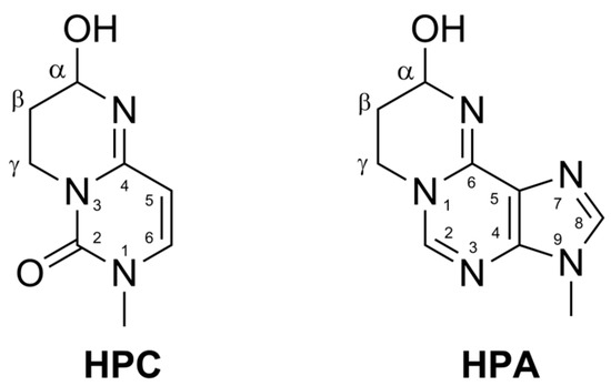 Structures of acrolein adducts to cytosine, 3,N4-α-hydroxypropanocytosine (HPC), and adenine, 1,N6-α-hydroxypropanoadenine (HPA). Note that the Cα atom of the hydroxypropano ring is asymmetric.