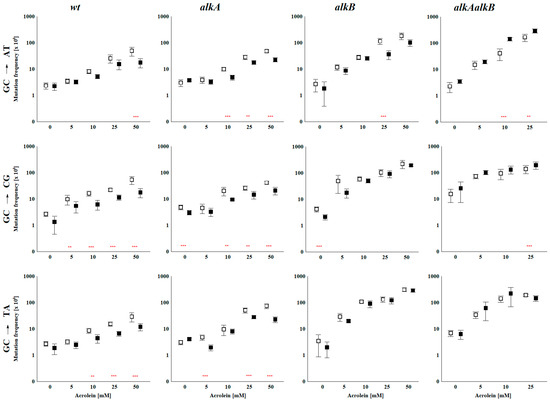 Frequencies of HPC-induced Lac+ reversions in the plasmid’s codon 461 of the lacZ gene. Plasmids pIF102, which indicate C→T transitions; pIF103, which indicate C→G transversions; and pIF104, which indicate C→A transversions, were treated with increasing doses of ACR in vitro and then replicated in wild-type, alkA, alkB, and alkAalkB E. coli strains. On the x-axis, the concentration (mM) of ACR used for plasmid modification is shown; on the y-axis, mutation frequency (MF), expressed as the number of revertants per 104 transformed cells, is presented. The vertical panels display MF results for different substitutions within a specific strain, while the horizontal panels compare MF results for a particular substitution across the studied strains. Mean ± standard deviation was calculated from at least three independent experiments. White and gray bars represent MF values in bacteria with uninduced and induced Ada responses, respectively. The statistical significance of differences between these values: ** p < 0.01, and *** p < 0.001.
