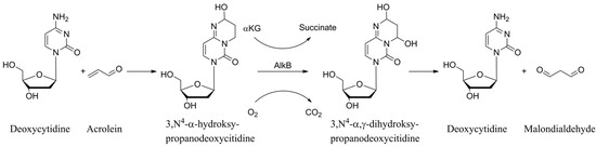 Drawing on the acrolein–cytosine reaction described in references [13,14], the established catalytic mechanism of AlkB outlined in [39,40,53,54], and the observation that malondialdehyde is the final product released during AlkB-mediated repair of ACR-modified guanine [44], as well as the fact that HPC is repaired completely [19], Figure 3 illustrates the formation of HPC in DNA and its subsequent repair by AlkB.