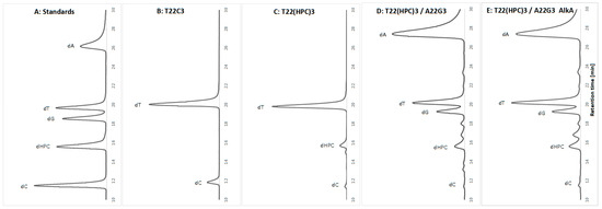 In our recent study [21], we demonstrated that AlkA glycosylase removes ACR adenine adducts (HPA) from DNA. However, using the same in vitro assay, we were unable to confirm AlkA’s ability to excise HPC as shown in Figure 4. The HPC adduct was generated under controlled conditions, allowing selective modification of cytosine residues only [52] in a single-stranded oligodeoxynucleotide that contained three cytosine (C) and 22 thymine (T) residues. As expected, the unmodified oligodeoxynucleotide contained only the dT and dC nucleosides (Figure 4B). Following ACR treatment, a third peak corresponding to dHPC appeared (Figure 4C). The extent of cytosine modification was estimated by comparing the HPLC profiles of nucleotides derived from the unmodified oligodeoxynucleotide to those from the oligodeoxynucleotide following ACR treatment. Since the molar absorption coefficient of HPC is unknown, these calculations are approximate. Considering that the absorption maxima of C and HPC differ (269 nm for C and 281 nm for HPC), we concluded that approximately 70% of cytosines were converted to HPC. The partially modified T22(HPC)3 oligodeoxynucleotide was then annealed with a complementary unmodified strand to form a double-stranded substrate for AlkA. In the control reaction, which did not include the enzyme, and after treatment with AlkA, the dHPC peak remained unchanged (Figure 4D vs. Figure 4E).