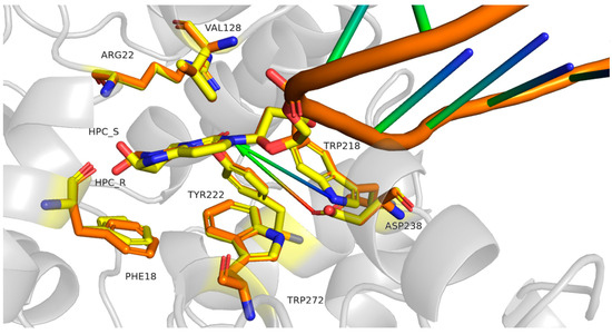 Modification of cytosine by ACR results in the formation of two stereoisomers (R and S), owing to the chirality of the carbon atom bearing the hydroxyl group (Figure 1). Based on the available crystallographic structures of the double-stranded DNA (dsDNA) bound by AlkA [29,56], we modeled the hypothetical position of both HPC stereoisomers within the active site of AlkA in complex with dsDNA, as depicted in Figure 5.